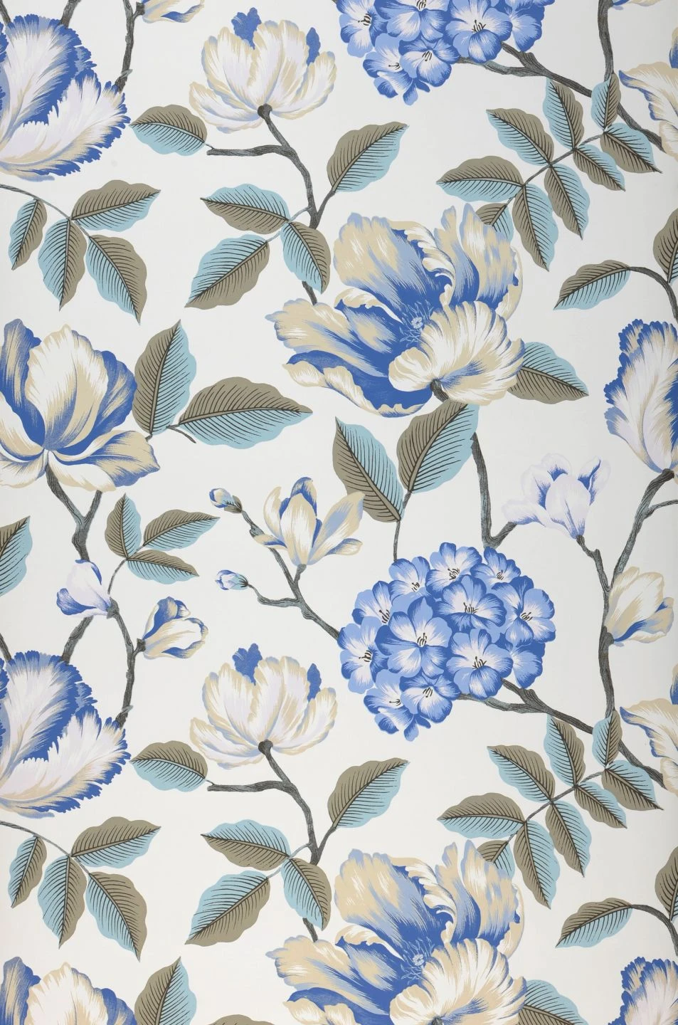 Hortensien mit ihren halbkugelförmigen Dolden von kleinen Blüten, ausladende Mohnblumen und sich eben öffnende Knospen der Magnolie bilden ein traumhaftes Ensemble von Blütenranken an Ihrer Wand. Der weiße Untergrund und die Farbverläufe der Blüten zwischen Weiß, hellem Elfenbein und Blautönen erzeugen duftige Frische. Das locker arrangierte Blumenmuster der Tapete Alba bringt Leichtigkeit in Ihre Küche, Ihr Schlafzimmer oder Ihr Wohnzimmer.