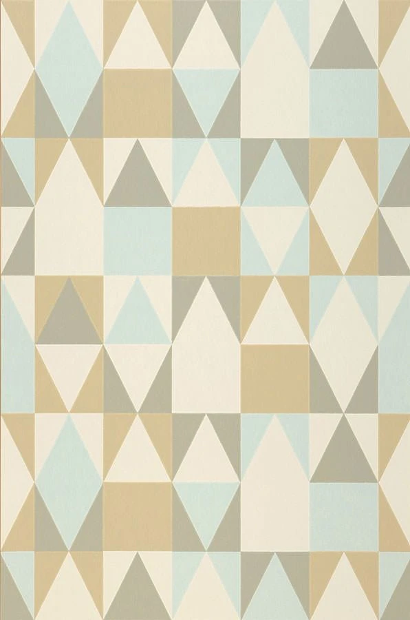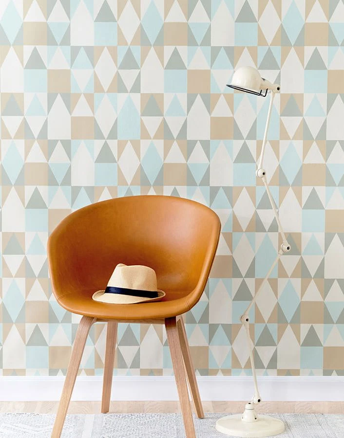 Dreiecke, Rechtecke und Rauten in den Farben Braunbeige, Grau und Pastelltürkis prägen die beliebte Tapete aus dem Designstudio Majvillan. Scandinavischer Stil , der beruhigt und erfrischt zugleich.