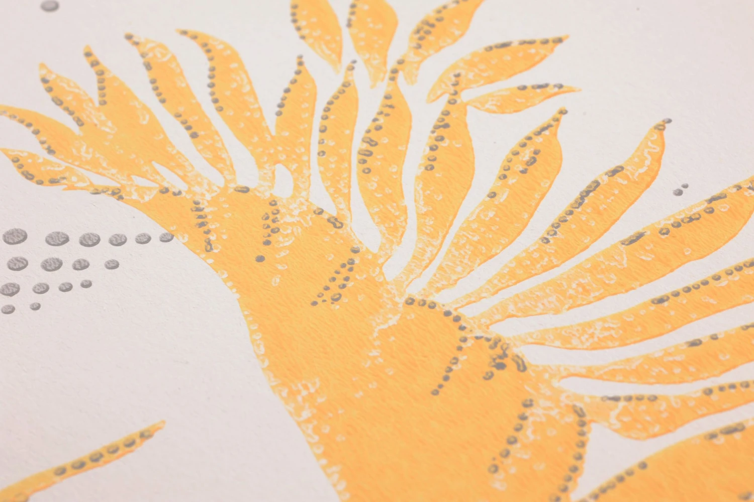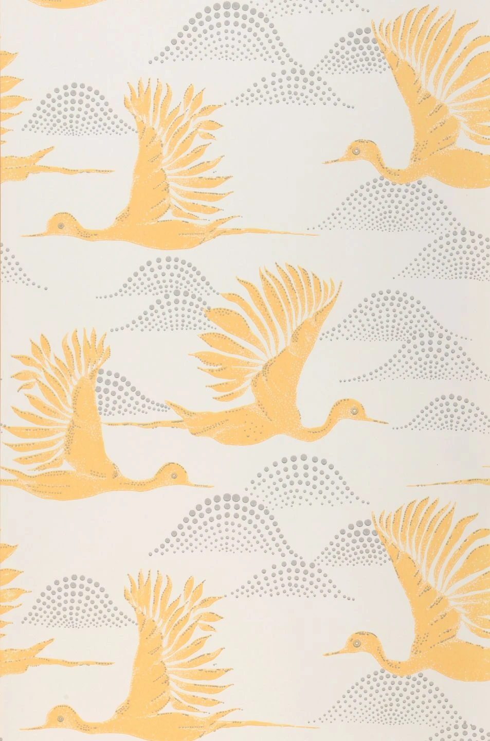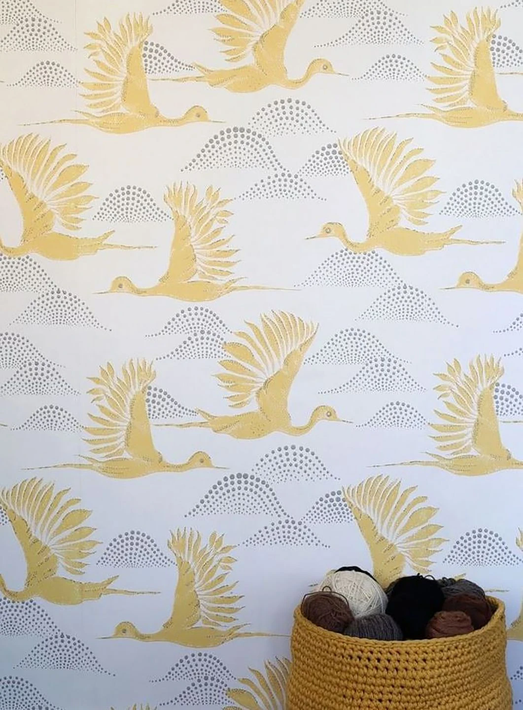 Freundliche maisgelbe Kraniche breiten ihre großen Schwingen aus und fliegen zwischen stilisierten, nur durch hellgraue Punkte angedeuteten Wolken am cremeweißen Himmel. Das Pünktchenmuster der Wolken findet seine Entsprechung in den weißen Tupfen und hellgrauen Punkten, mit denen das Gefieder der großen Vögel verziert ist. Das verwendete Leimdruckverfahren gibt der Papiertapete den Charme traditionellen Handwerks.