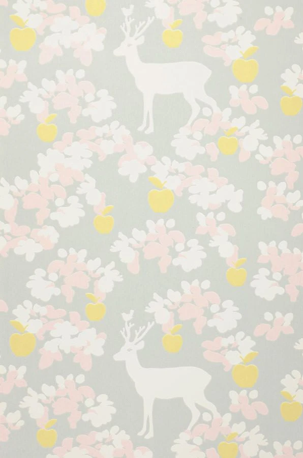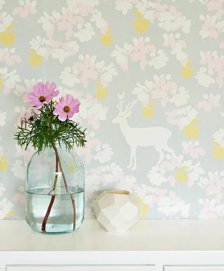 Kommen Sie mit in den berauschenden Apfelgarten von Majvillan. Er kennt keine Grenzen und heißt Kinder wie Erwachsene herzlich willkommen. Hirsche, blühende Apfelzeige und Früchte zeigen sich als perfekte Kombination für die neue Romantik, dir sich nicht auf bestimmte Räume begrenzt, sondern offen für alles ist. Die Farben Hellgrau, Blassgelb, Blassrosa und Cremeweiß verleihen ein fruchtig-spritziges Gefühl.