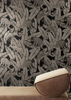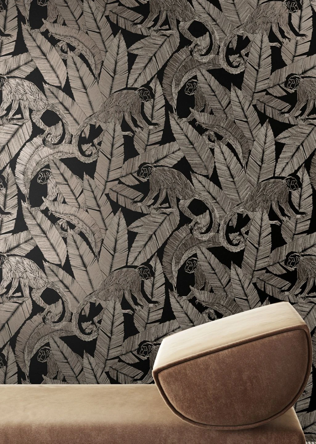 Schimmernd setzen sich die Musterfarben Grauweiss und Perlbeige vom tiefschwarzen Untergrund ab. Eine clevere Linienführung erschafft Blätter, hinter denen sich die putzigen Totenkopfäffchen zu verstecken scheinen. Gestalten Sie Akzentwände im kolonialen Südamerika Stil und lassen Sie die exotische Welt Brasiliens mit dieser glamourösen Tapete erstrahlen.