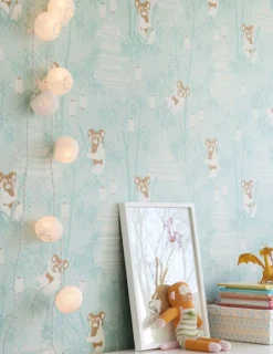 Weiß, Braun und Pastelltürkis verleihen der szenischen Darstellung von großen Pandabären in Bambusbäumen eine weiche Ausstrahlung, die den individuellen Farbwünschen im Kinderzimmer gerecht wird. Chinesische Tempel und Palastbauten verraten, wo diese Pandas leben. Auf in ein vergnügt entspanntes Spielabenteuer.