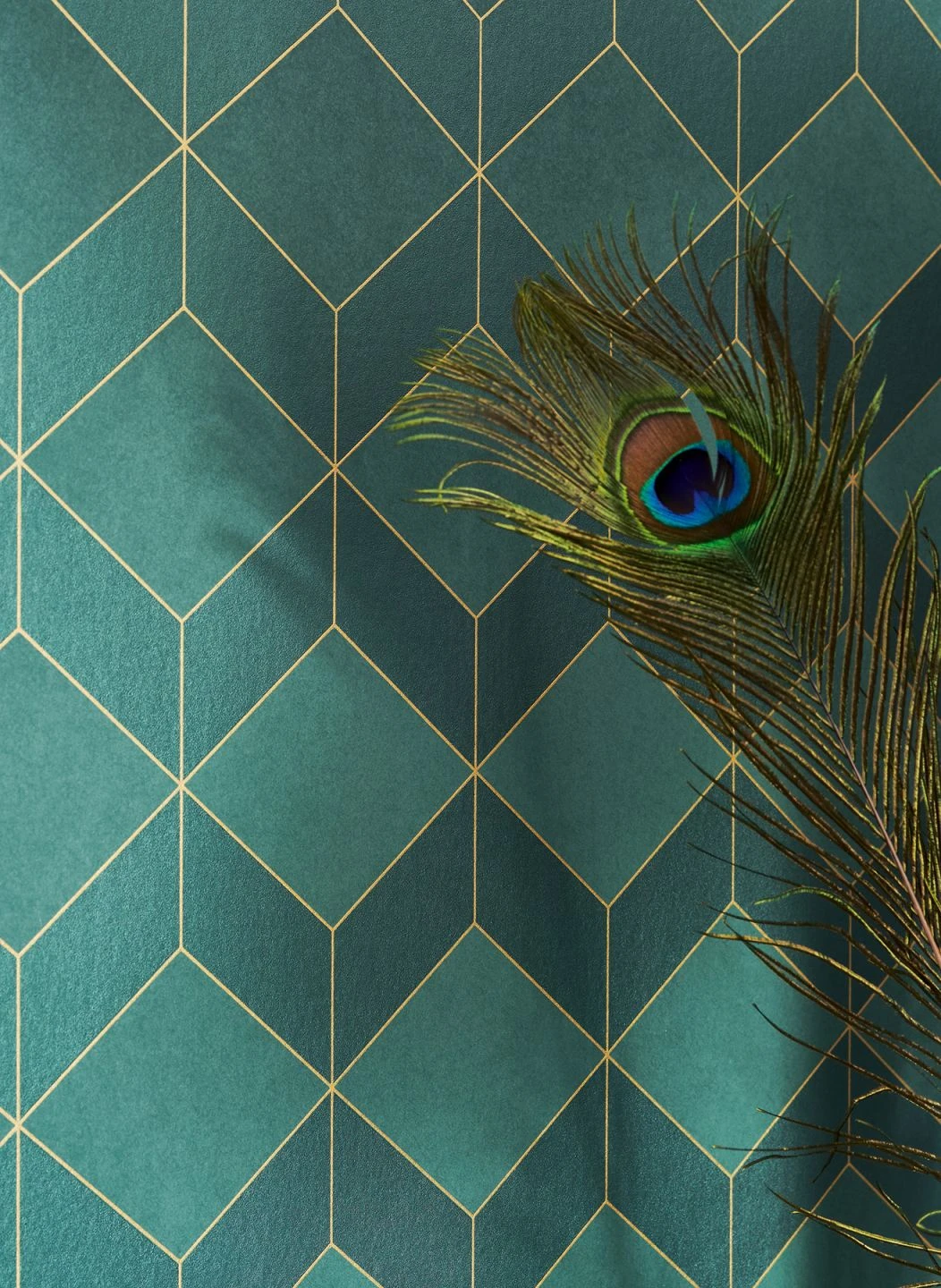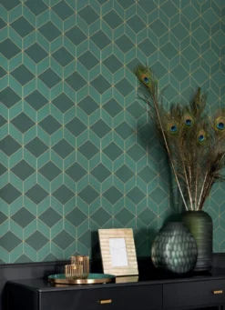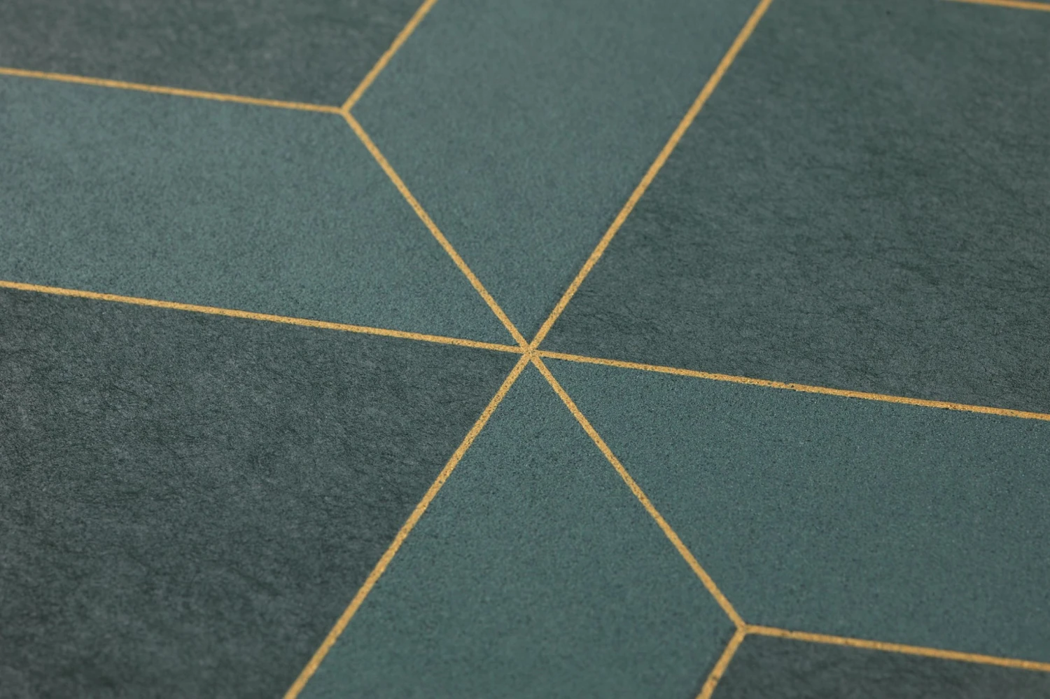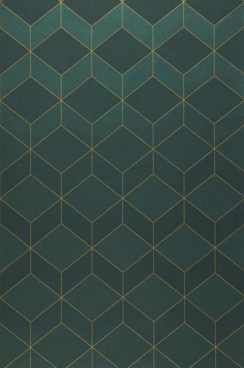 Zwei märchenhafte Grüntöne, einer leicht schimmernd, der andere matt, offenbaren das Geheimnis dieser Art-Deco-Tapete: Die aus den Farbflächen entstehenden geometrischen Formen mit ihren feinen schimmernden Umrissen in goldener Farbe lösen die glatte Fläche Ihrer Wand auf und erwecken den Eindruck dreidimensionaler Würfel. Geschickt verbinden sich die klaren Linien des Art Deco mit dem satten Grün der Tapete zu einem edlen Gesamtbild.