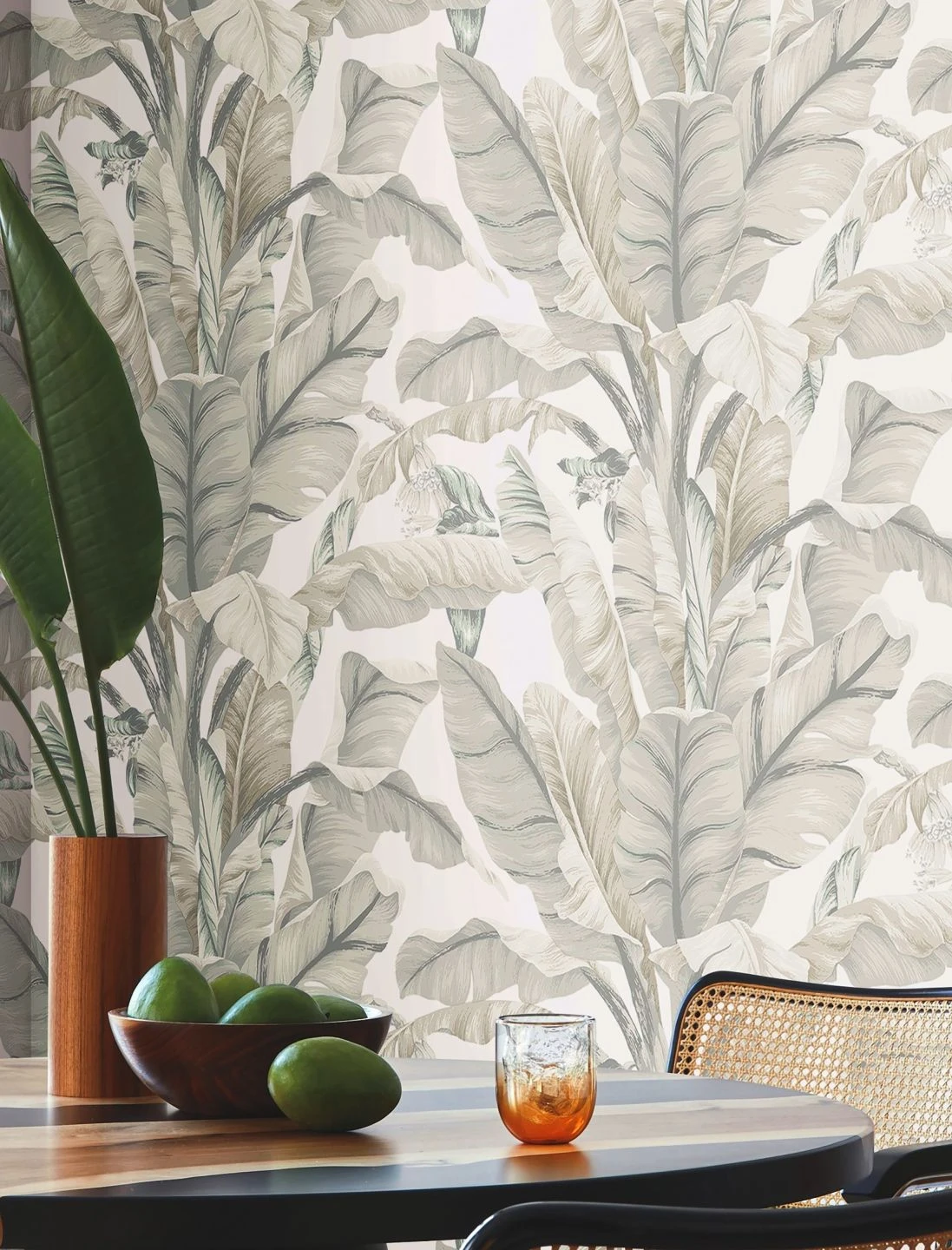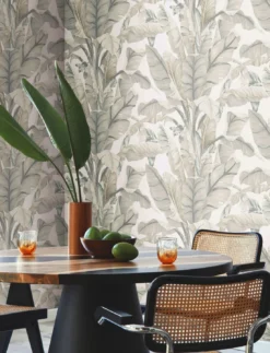 Die opulente Fülle von tropischen Bananenblättern und Bananenblüten ist hier ganz in zarten, hellen Grautönen auf Cremeweiß gehalten. Die sanften Farben bilden einen reizvollen Kontrast zum kräftigen, üppigen Wuchs der Pflanzen. Papiertapete Belize macht aus Ihrem Heim ein tropisches Paradies und ist vielseitig einsetzbar, denn sie passt sich durch ihre hellen, neutralen Farbtöne jeder Einrichtung mühelos an.