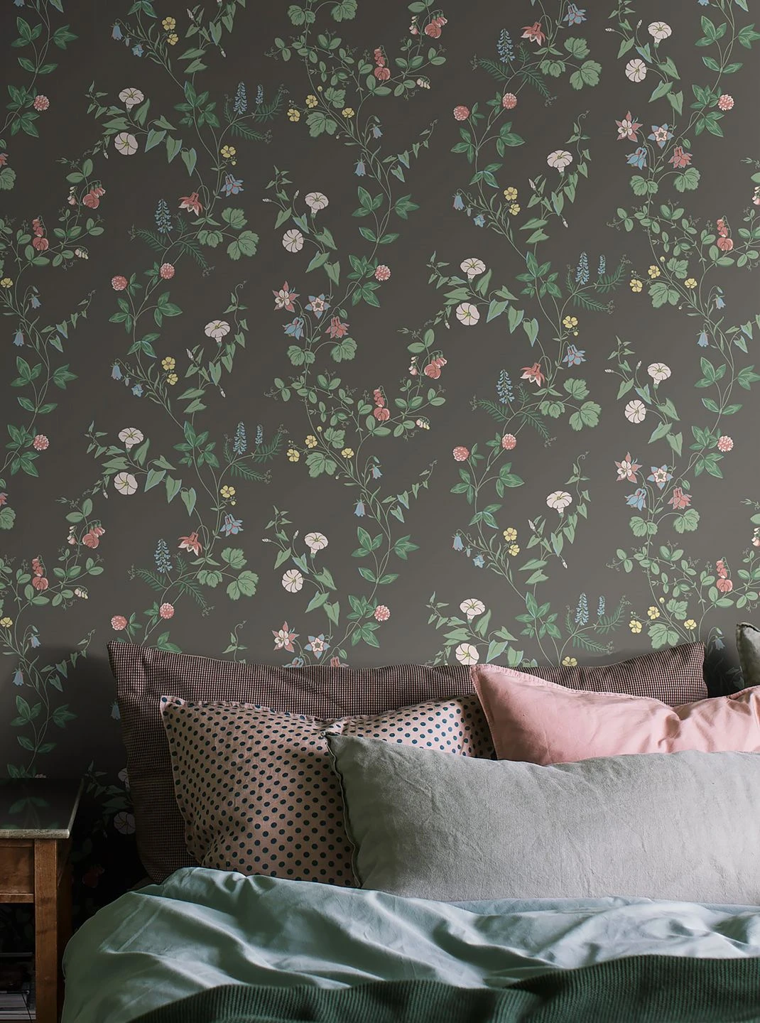 Sommerliche Leichtigkeit kontrastiert mit ruhiger Festigkeit: Die Vielfalt der Sommerblumen in zartem Hellgelb, Hellgrün, Pastellblau und Rosatönen bildet ein luftiges, farbenfrohes Gegengewicht zum Stabilität ausstrahlenden basaltgrauen Untergrund der Vliestapete. Je nachdem, ob Sie mit dunklen Möbeln oder einer der hellen Musterfarben kombinieren, unterstreichen Sie entweder die sommerliche Lebensfreude oder die Solidität, die die Tapete verströmt.