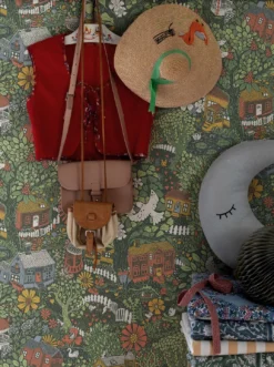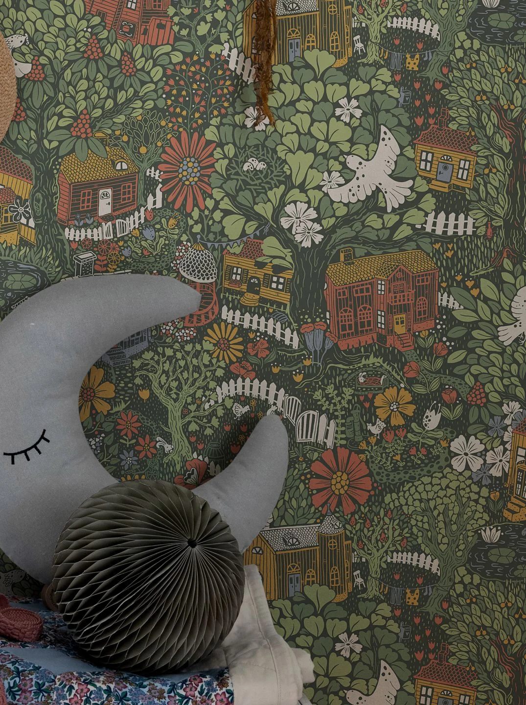 Bunt und voller Abwechslung wie das Leben selbst ist die phantasievolle Vliestapete Birgitta, die große und kleine Betrachter in eine skandinavische Landschaft versetzt. Blühende Bäume und riesige Blumen, dazwischen die typischen gemütlichen Holzhäuser komplett mit weiß gestrichenen Zäunen, laden dazu ein, vom Leben auf dem Land zu träumen. Birgitta schmückt ein farbenfrohes Kinderzimmer ebenso wirkungsvoll wie ein freundliches Studio im skandinavischen Stil.