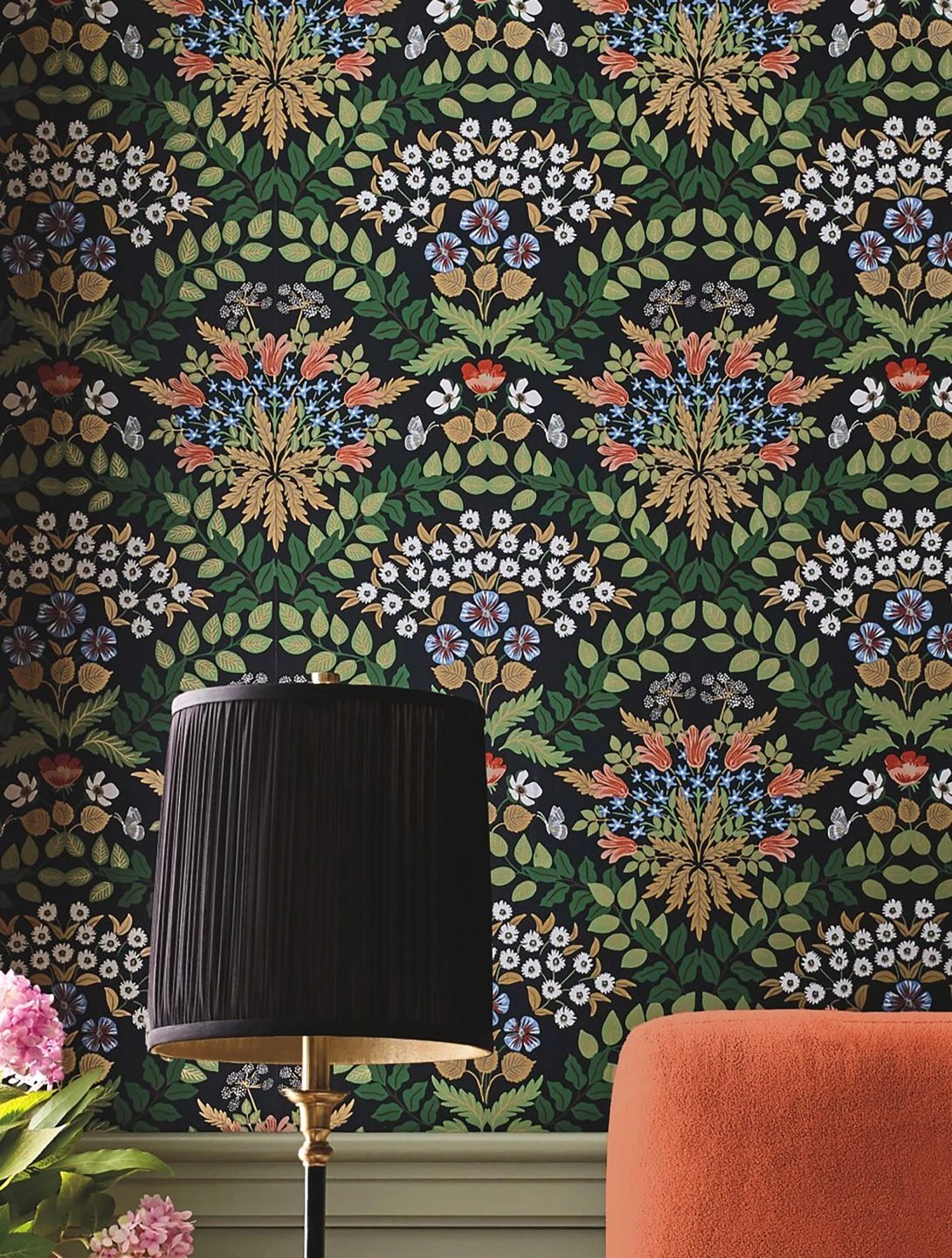 Besonders edel wirken die farbenprächtigen Arrangements zierlicher, fein gezeichneter Blüten wie Veilchen und Vergissmeinnicht auf dem schwarzen Untergrund der Vliestapete Bramble. Mit einem sicheren Gespür fürs Detail bis hin zu der Zeichnung der Blütenblätter verbindet Rifle Paper die klassische Anordnung der Ornamente mit einer zeitlos aktuellen Ästhetik. Sie fügen dunklen Einrichtungen tolle Farben hinzu oder erden Ihre Möbel in einer der Musterfarben.