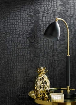 Das Design dieser extravaganten Vliestapete in dunklem Anthrazitgrau imitiert die Narbenstruktur echten Krokodilleders und schafft so eine außergewöhnliche Atmosphäre. Die Oberfläche aus Vinyl hat eine fühlbar reliefartige Struktur und sorgt gleichzeitig dafür, dass die Tapete hoch waschbeständig ist und somit auch für die Gestaltung eines außergewöhnlichen Badezimmers bestens einsetzbar ist.