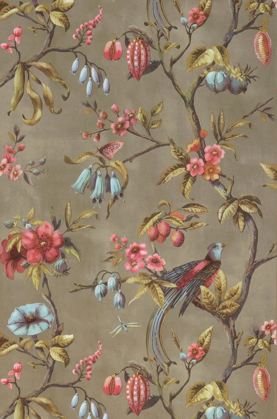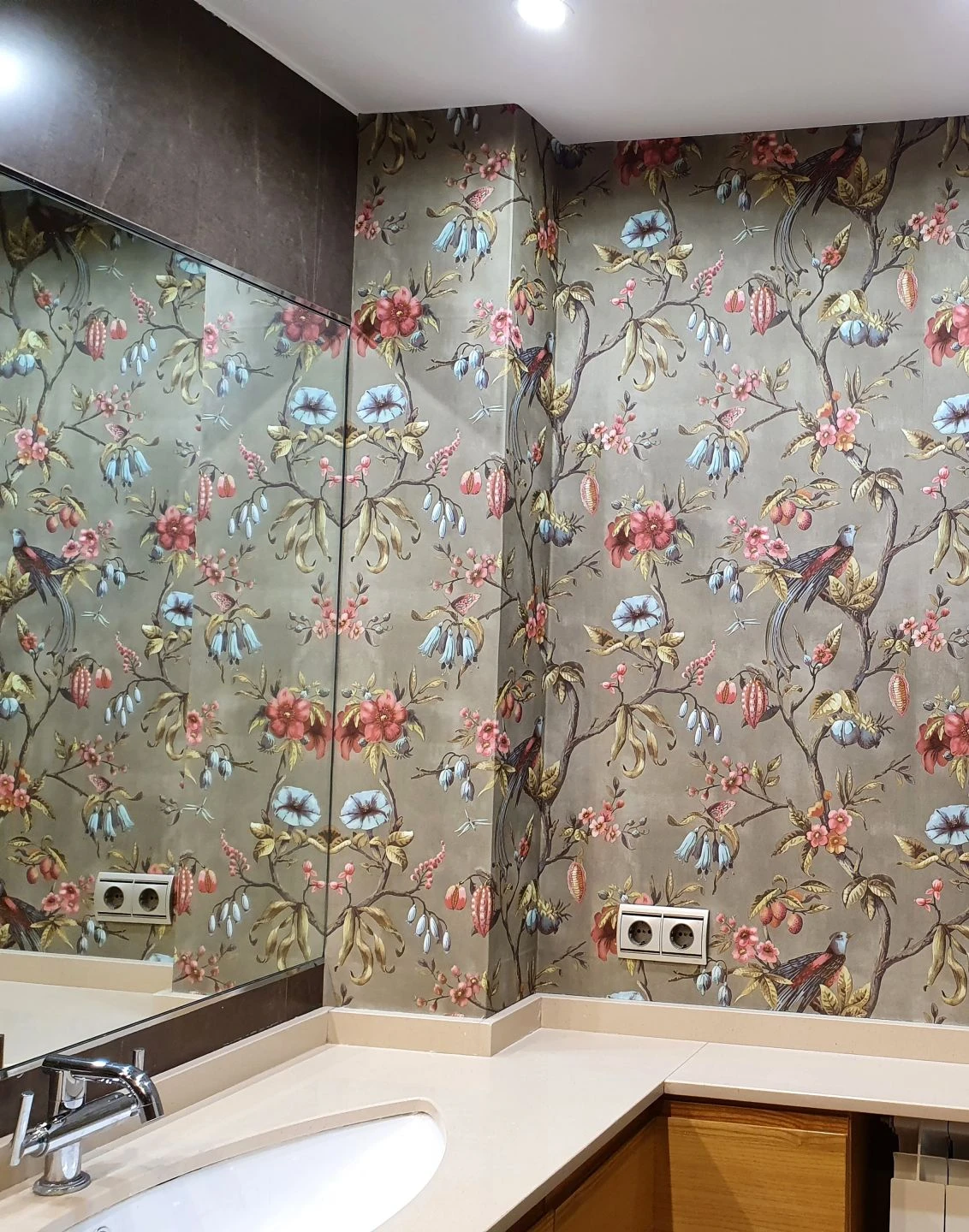 Das Gefieder bunter Paradiesvögel leuchtet mit den phantastischen Blüten und den Flügeln der Schmetterlinge um die Wette. Die hellen Blautöne, Rosé und Violett sowie die Farben der Blätter und Zweige erhalten einen farblich passenden Hintergrund durch Schattierungen von Olivgrau. Das Vinyl, das für die Oberfläche verwendet wurde, sorgt für unkomplizierte Reinigung der Tapete und ermöglicht Ihnen, sie sogar zur Verschönerung Ihres Badezimmers zu nutzen.