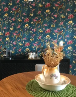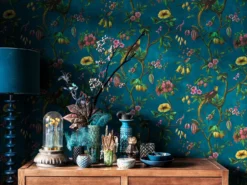 Wie in einem tropischen Paradies heben sich hier prächtige Vögel, bunte Schmetterlinge und phantasievolle Blumen in leuchtendem Orange, Pink und Gelb vom kräftigen Ozeanblau des Hintergrunds ab. Durch die vinylbeschichtete Oberfläche erhalten die Farben zusätzliche Strahlkraft. Gleichzeitig sorgt das Oberflächenmaterial dafür, dass Sie die Tapete vielseitig einsetzen können – sogar für das Badezimmer eignet sie sich perfekt!