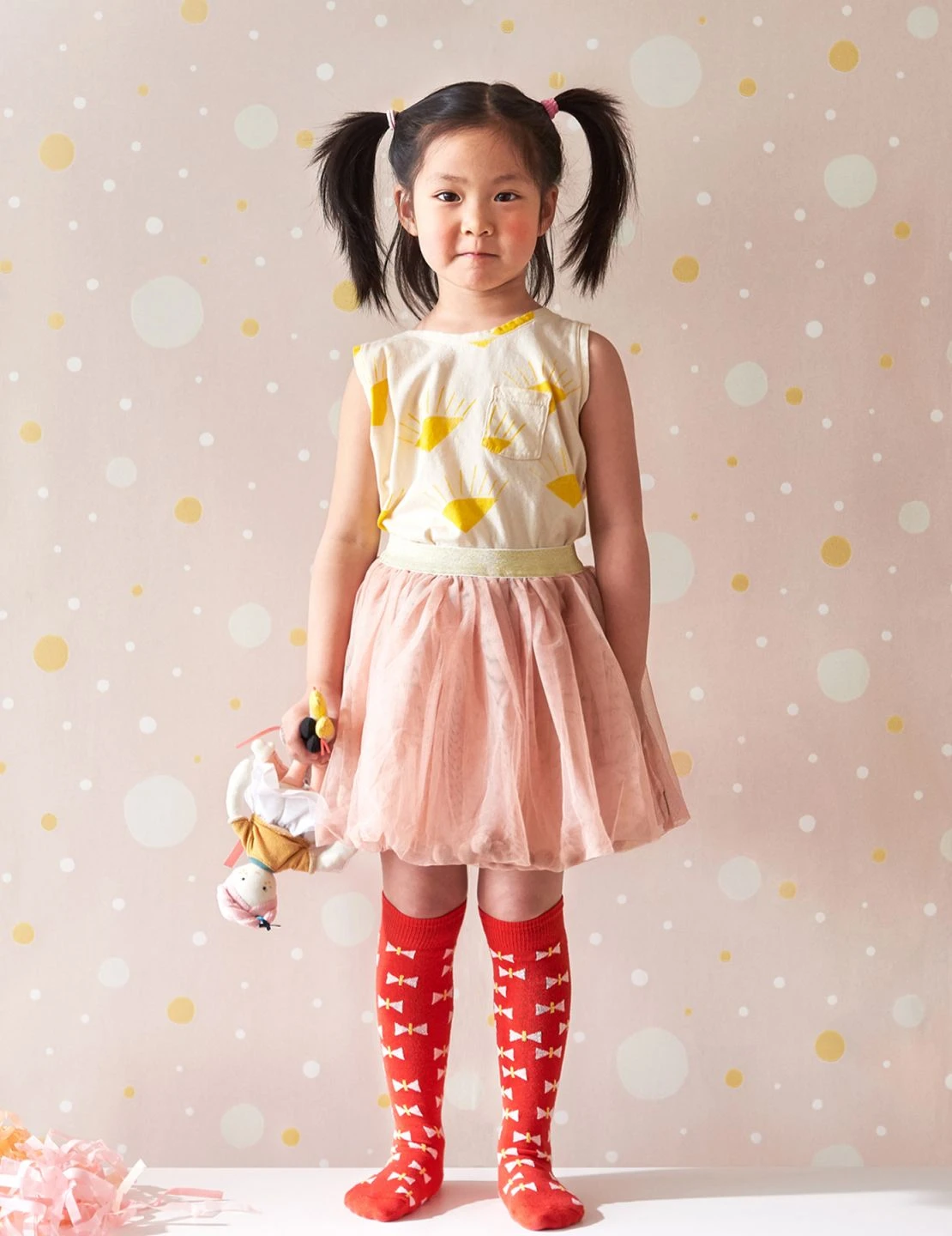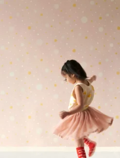 Für Dich soll es Confetti regnen – Zartrosa bildet den romantischen Hintergrund, vor dem die weichen Konfettiflocken in Weißtönen und Hellgelb Schimmer tanzen. Die liebevolle Kindertapete des Designerlabels Majvillan stimmt das Mädchenzimmer verträumt und lässt viele spielerische Assoziationen zu.