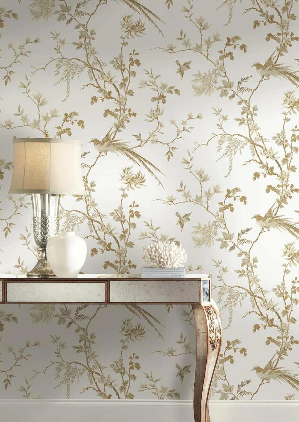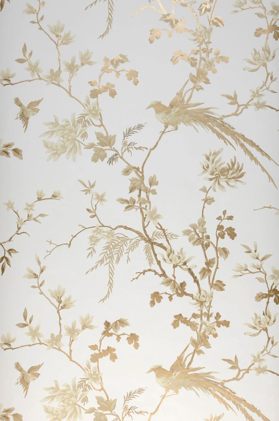 Aus einem orientalischen Märchen scheint das zarte Design mit seinen exotischen Vögeln und den Zweigen voller Blüten und feinen Blättern zu stammen. Schimmerndes Braun und Perlgold zwischen den Creme- und Grautönen setzen auf dem weißen Grund wunderschöne Akzente. Der Farbauftrag im Leimdruckverfahren macht die Vliestapete zu einem ästhetischen Genuss, mit dem Sie eine perfekte Kulisse für Ihre Einrichtung im asiatischen Stil schaffen.