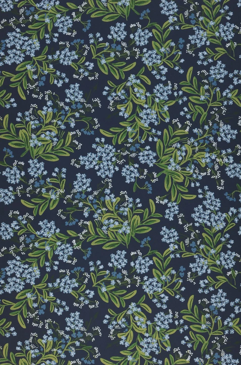 Die intensive Wirkung des Zusammenspiels verschiedener Blautöne bestimmt den Charakter von Cornflower. Im typisch handgemalten Stil von Rifle Paper sind kleine hellblaue und weiße Blüten über und über auf der Fläche der Tapete verteilt. In Verbindung mit dem Stahlblau des Untergrunds und den Grüntönen der Blätter entsteht eine Stimmung wie die zur blauen Stunde: ruhig und gleichzeitig voller Lebendigkeit.
