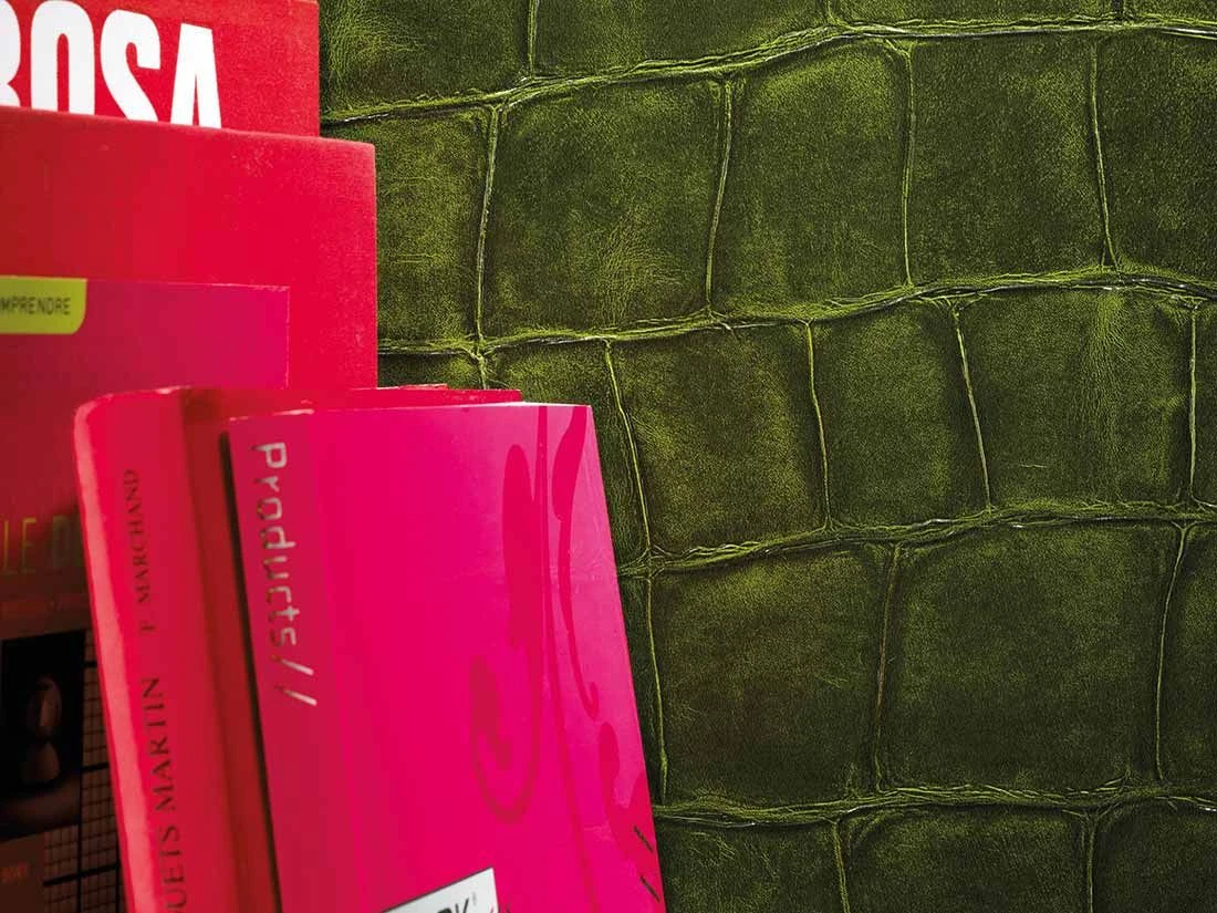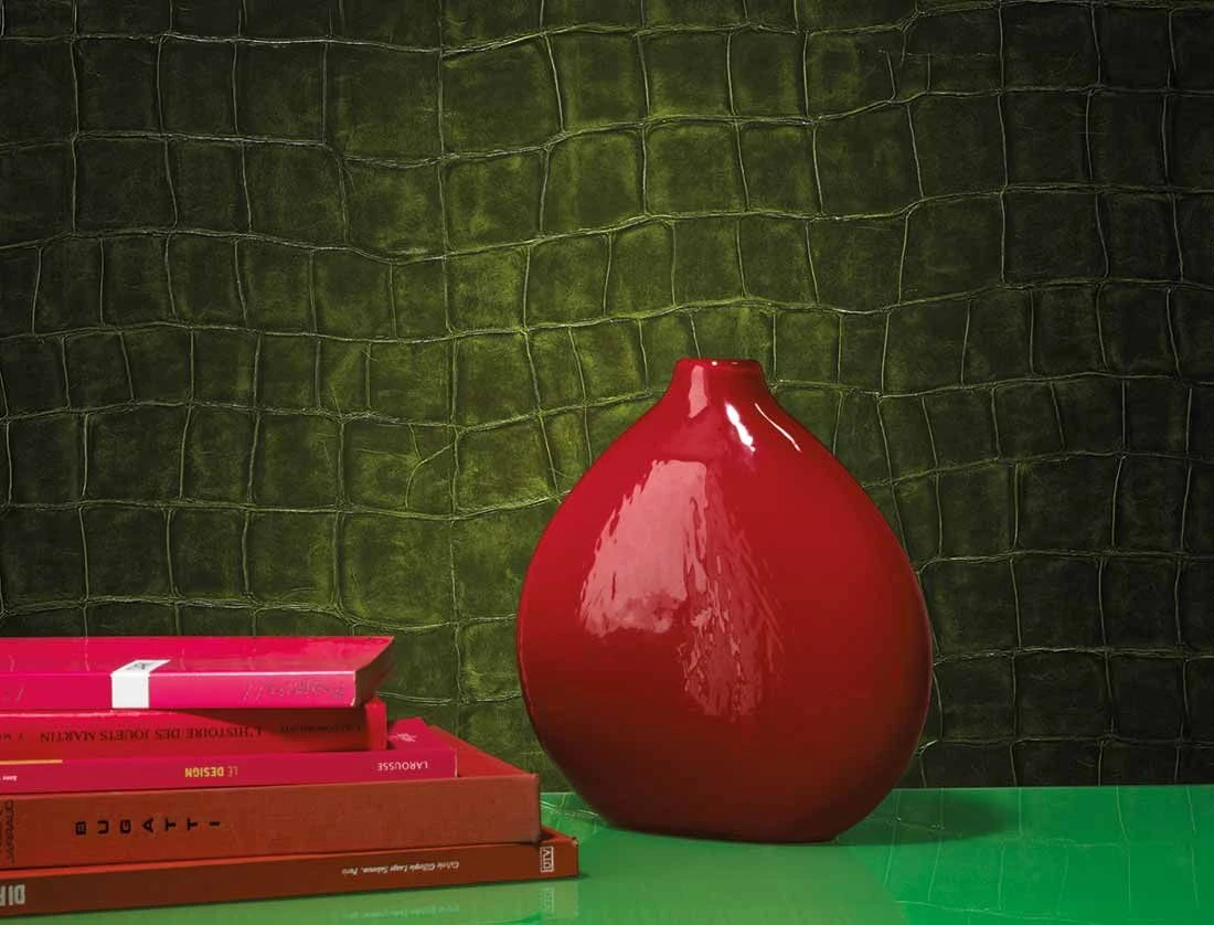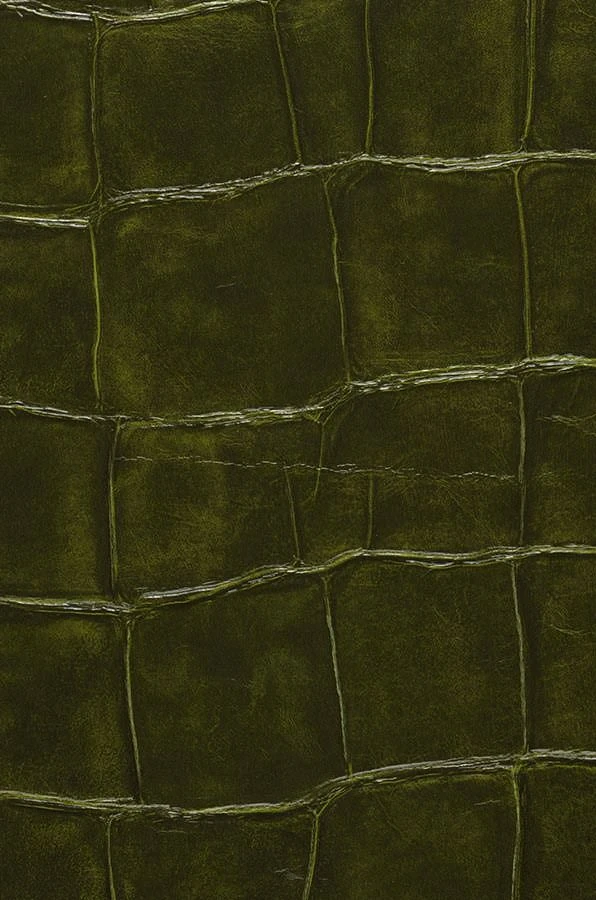 Die Krokodilleder-Imitation in kräftigem, glänzendem Dunkelgrün macht jedes Zimmer, das Sie mit ihr auskleiden, zu einem besonderen Anblick. Die unregelmäßige Narbenstruktur des Krokodilleders ist fühlbar in die Oberfläche geprägt und lässt die Imitation aussehen wie das Original, ohne dass dafür ein Tier sein Leben lassen musste. Durch das als Oberflächenmaterial verwendete Vinyl ist die Tapete hoch waschbeständig und auch für ein exklusives Badezimmer bestens geeignet.