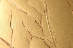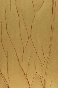 In Rot heben sich die feinen Falten von der goldenen Grundfarbe ab. Die Zweigstrukturen, in denen die Crush Tapete gearbeitet ist, formen stilisierte Baumlandschaften, die den Raum mit wahrhaft wachsender Kraft erfüllen. Kunst, Glamour, faszinierende Moderne vereinen sich in dieser erlesenen Design Tapete wunderbar.