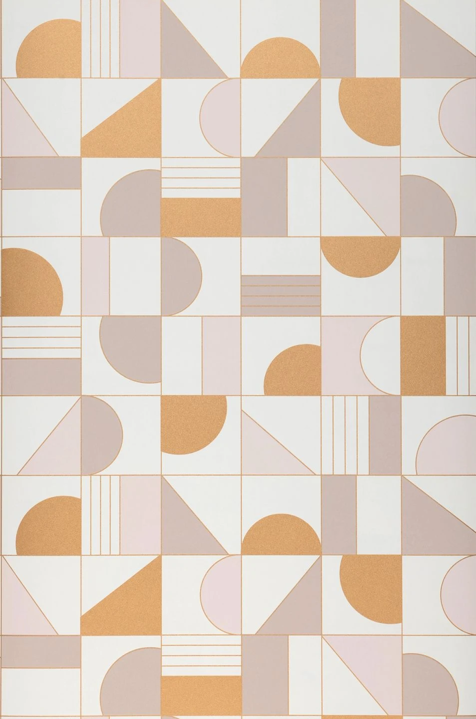 Klare, sachliche geometrische Formen wie Kreisausschnitte, Rechtecke und Dreiecke stehen in spannungsvollem Gegensatz zu den sinnlichen Farben: Romantische Rosé- und Graubrauntöne und schwelgerisches Gold ergänzen das Cremeweiß des Untergrunds um eine sanfte, freundliche Komponente. Die scheuerbeständige Vinyloberfläche erlaubt es auch, eine gastliche Küche oder ein exklusives Bad mit der Vliestapete zu gestalten.