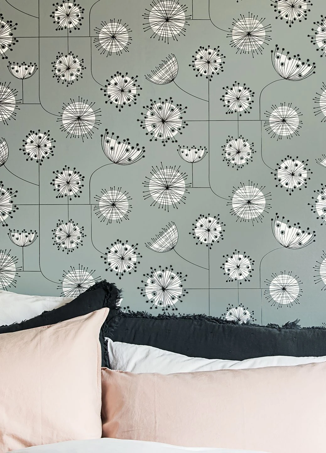 Die flauschigen weißen Kugeln der Pusteblumen haben für diese außergewöhnliche Designtapete Modell gestanden. Mit wenigen Strichen skizziert, miteinander verbunden wie die Teile eines Mobiles und gleichzeitig voller müheloser Leichtigkeit, machen die Pusteblumen auf dem zementgrauen Grund eine tolle Figur. Ihr ausdrucksvoller Charakter und ihre neutralen Farben machen Dandelion Mobile zu einer reizvollen Kulisse für eine moderne Wohnlandschaft.