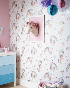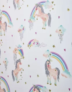 Ein Regenbogenland mit märchenhaften Einhörnern und ausgewählten schimmernden Details in Gold und Silber – Kindertapete Daria regt die Fantasie für zauberhafte Geschichten an. Auch dem Streicheln der anmutigen Fabelwesen kann hier keiner widerstehen. Die waschbeständige Papiertapete mit fühlbarem Relief verträgt das prima.