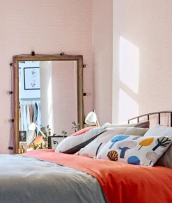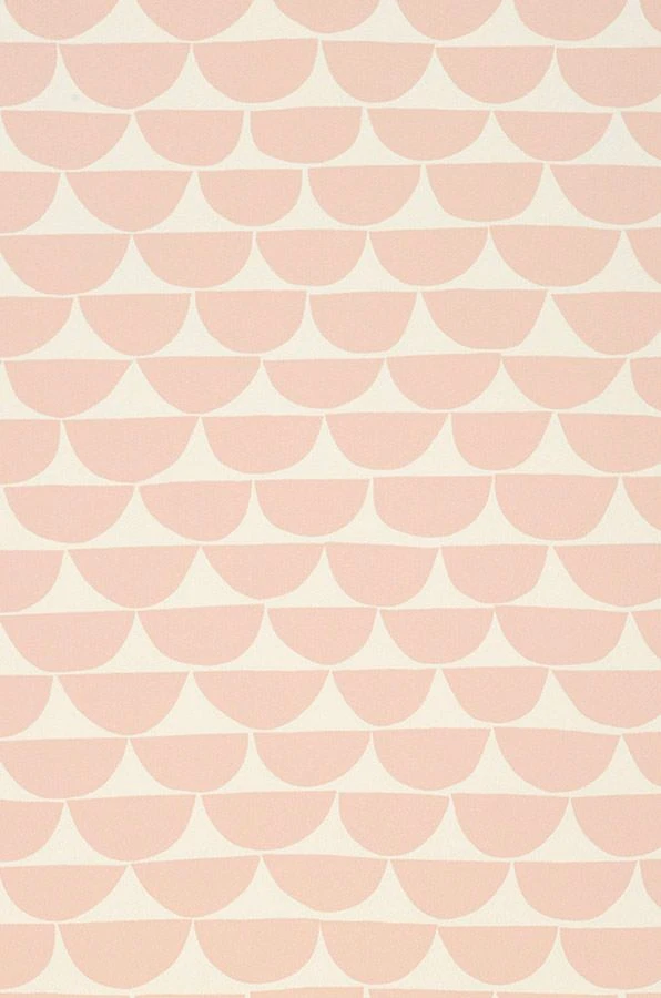 Munter und in Pastellrosa setzen sich die Halbkreise zu einem pfiffigen Muster zusammen, das sich optisch je nach Betrachtungswinkel und Betrachtungsintensität verändert. Mal lassen sich hintergründige Dreiecke erkennen, mal wirken die Halbkreise wie kleine Punkte aus der Ferne – Eine betörende Verlockung für rosa Romantik-Räume.