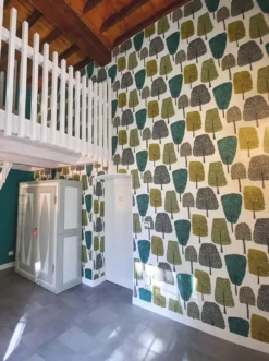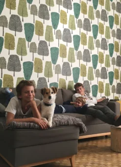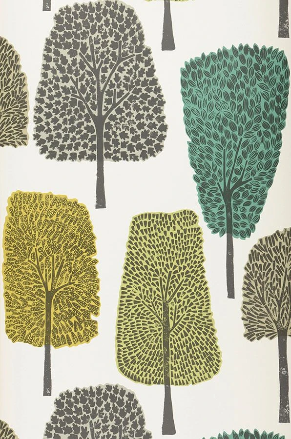 Stilisierte Laubbäume stehen dicht an dicht in einem freundlich-hellen Laubwald. Die Baumkronen und verschieden geformten Blätter symbolisieren die Vielfalt der heimischen Bäume. Von leuchtendem Grüngelb über Olivgrau bis hin zu Türkisgrün reicht die Farbpalette. Die Blätter scheinen mit Stempeln in die Baumkronen gestempelt. Eine gelungene Mischung aus Naturnähe und Stilisierung, die sich mit Holztönen oder einer der Musterfarben bestens verträgt.