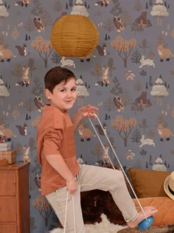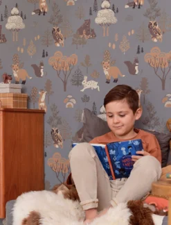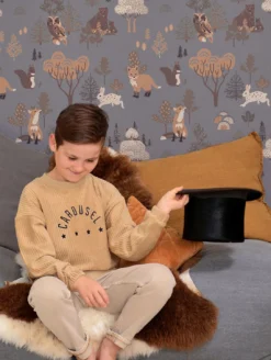 Tief drinnen im Wald verbergen sich Tiere in Hülle und Fülle. Ein Fuchs schnuppert in den Wind, eine Bärenfamilie sitzt im Gras, ein Waldkauz hockt auf einem Zweig. Dazwischen stilisierte Bäume und Büsche. Die schöne Vliestapete aus dem Hause Majvillan, hergestellt im traditionellen Leimdruckverfahren, nimmt Ihr Kind mit auf einen Waldspaziergang, auf dem es viel zu entdecken gibt. Die Beige- und Brauntöne strahlen in Verbindung mit dem blaugrauen Grund angenehme Ruhe aus.