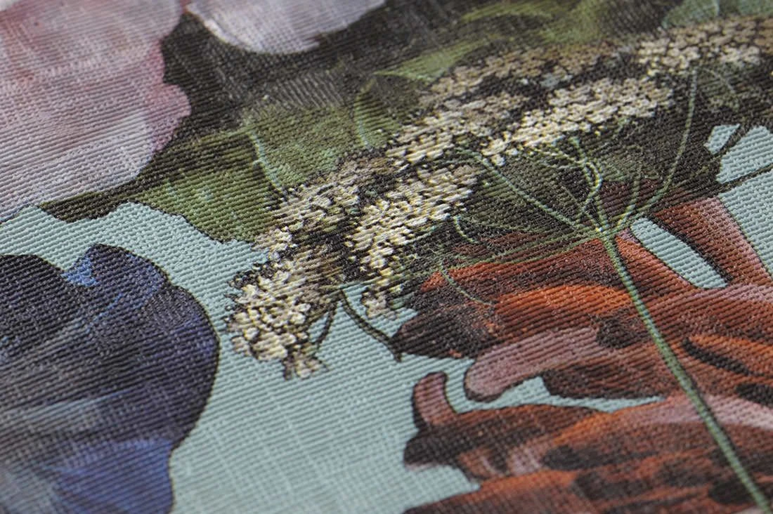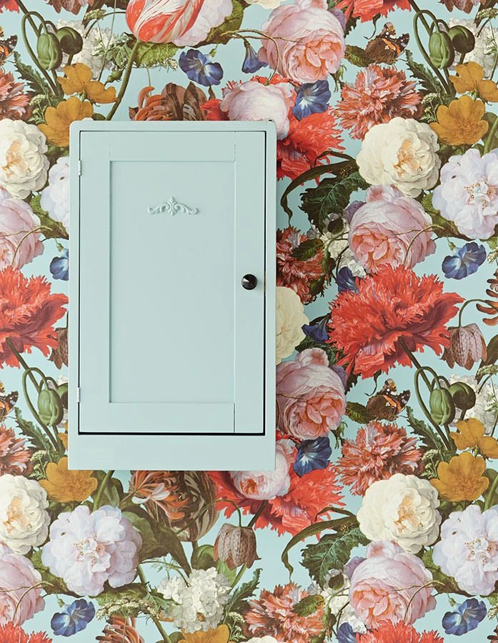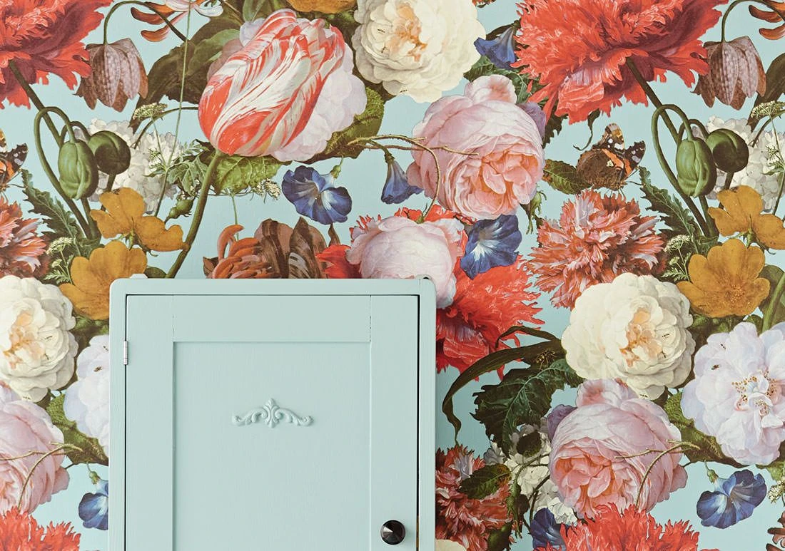 Der helle, pastelltürkisfarbene Untergrund dieser prachtvollen Vliestapete ist über und über mit Blumen bedeckt, die aus dem Gemälde eines niederländischen alten Meisters stammen könnten. So detailgetreu und realistisch sind sie dargestellt, dass man meint, ihre zarten Blütenblätter berühren zu können. Die Vinyloberfläche mit ihrer spürbaren Textilstruktur ist hoch waschbeständig und macht die Tapete zu einem Blickfang sogar in Ihrem Bad.