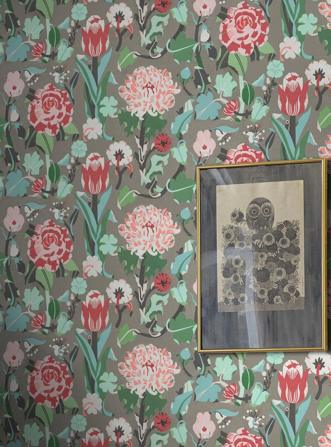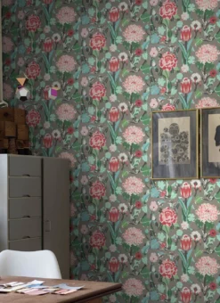 Blumen mit großen Blüten in Rot- und Rosatönen schaffen ein lebendiges Ambiente mit positiver Ausstrahlung. Die flächige, stilisierte Darstellung der Blüten und Blätter verleiht ihnen große Ausdrucksstärke, und auf dem quarzgrauen Untergrund entfalten die Farben eine besondere Strahlkraft. Vliestapete Eleonore schafft eine Verbindung zwischen dem traditionellen floralen Tapetendesign und aktueller Ästhetik.