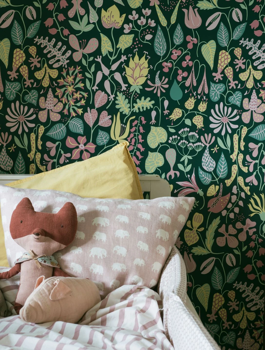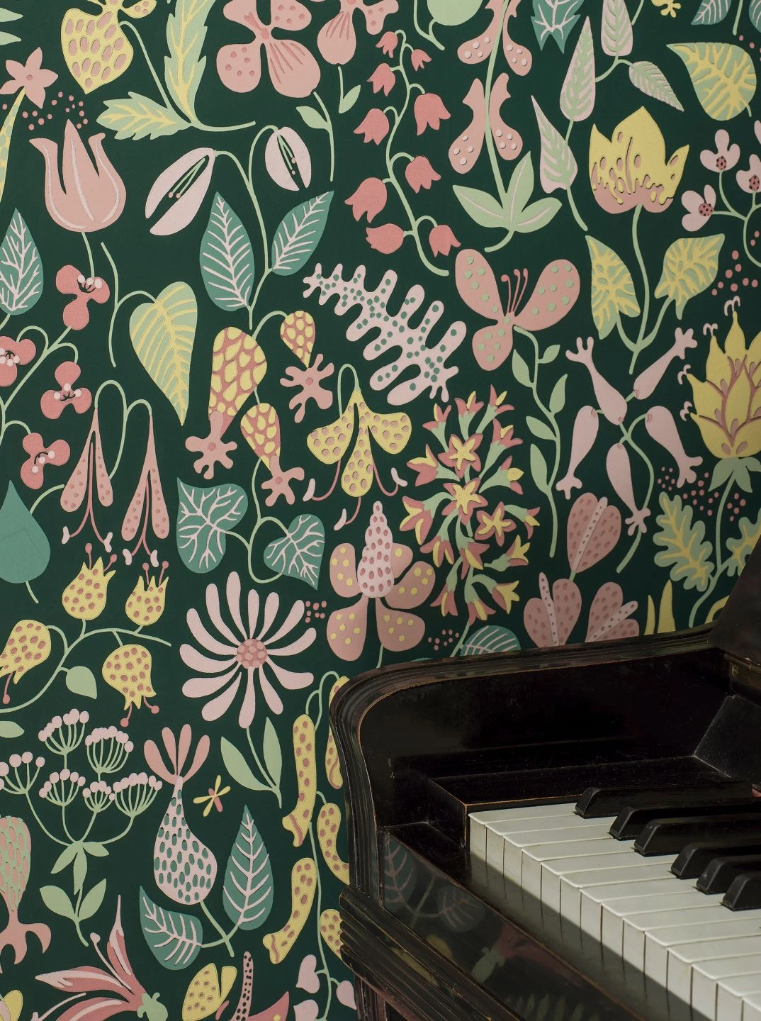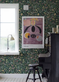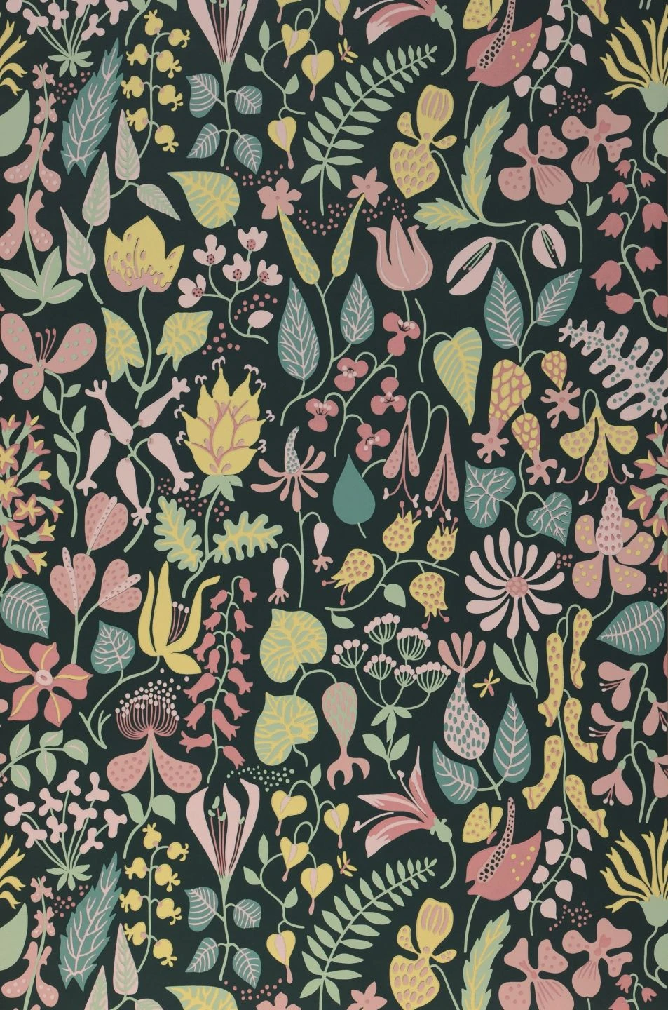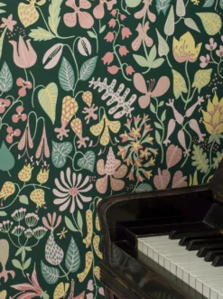 Bauchige Glockenblumen, zarte Margeriten, Lilien mit ihren auffälligen Staubgefäßen, ausladende Tulpen, exotisch geformte Orchideen und vieles mehr – die Formenvielfalt der stilisierten Blumen auf der Vliestapete „Eurynome“ sucht ihresgleichen. Zwischen den flächig gemalten, mit Mustern verzierten Blüten ranken ganz unterschiedlich geformte Blätter. Die hellen Pastelltöne heben sich angenehm vom schwarzgrünen Hintergrund ab.