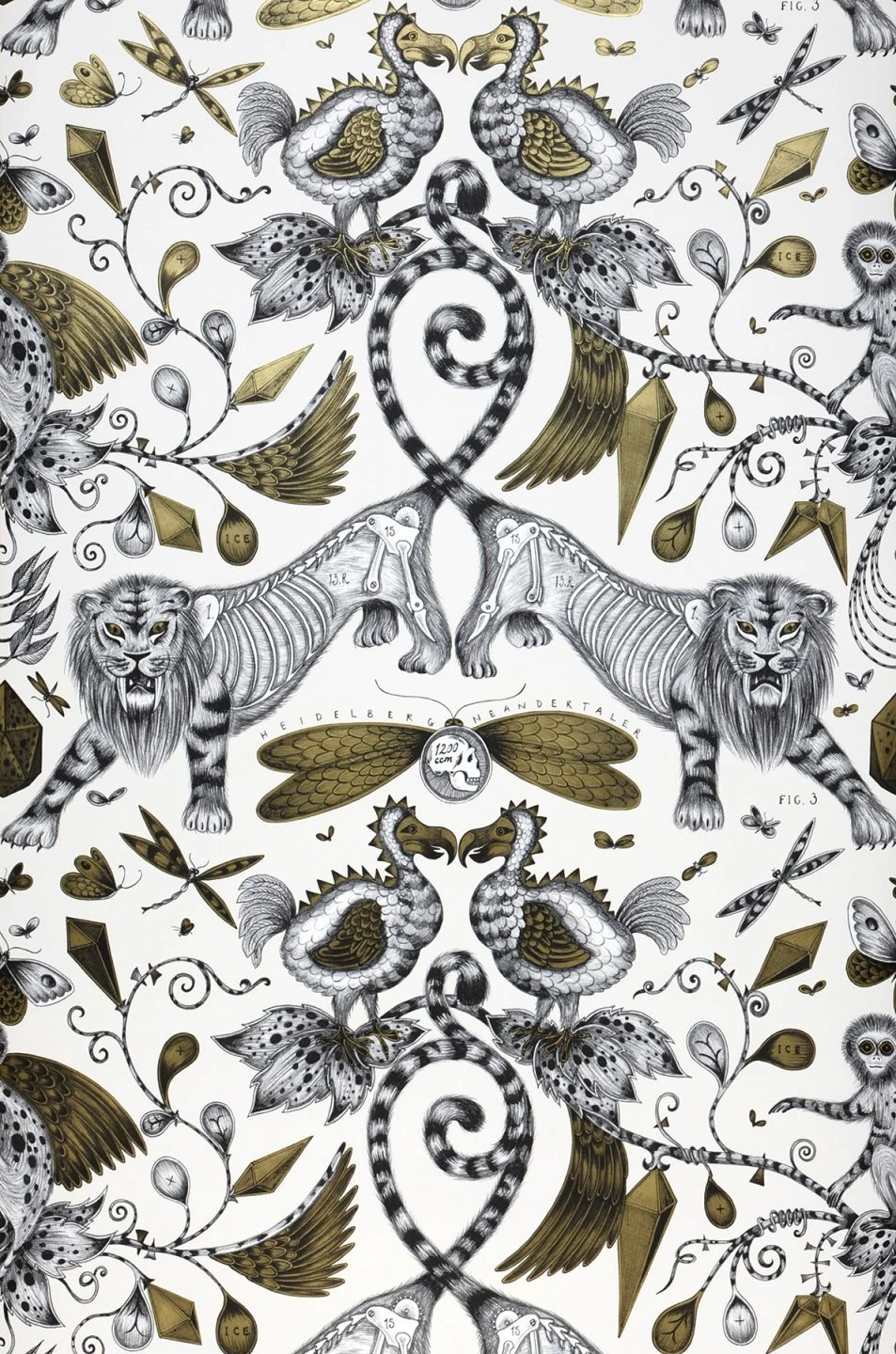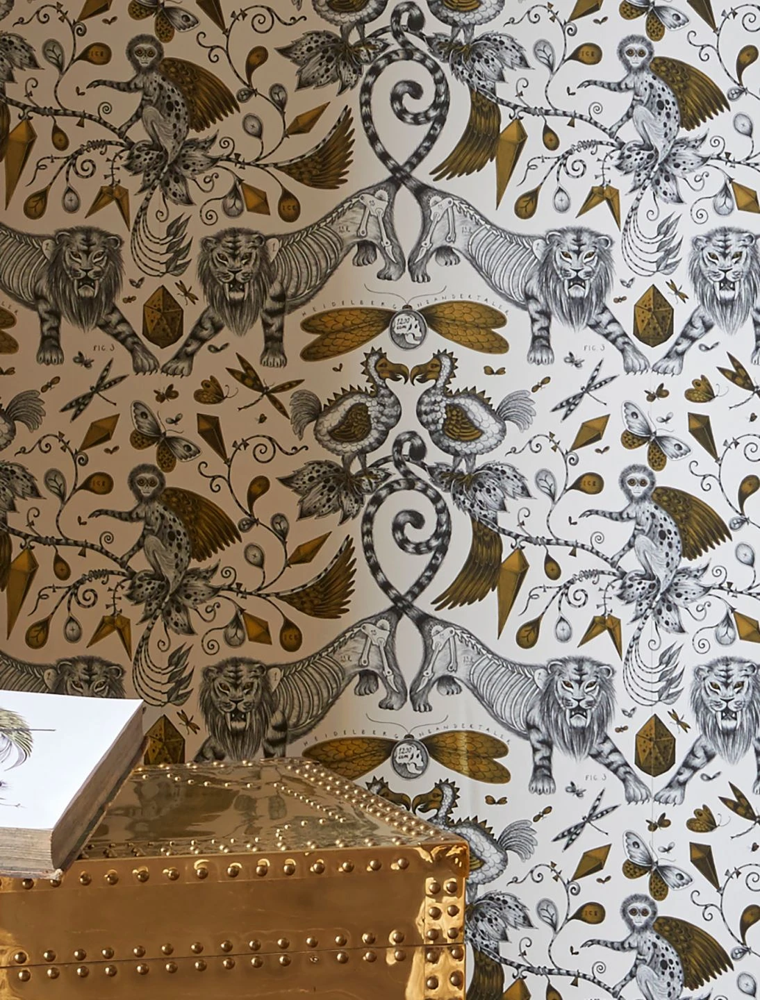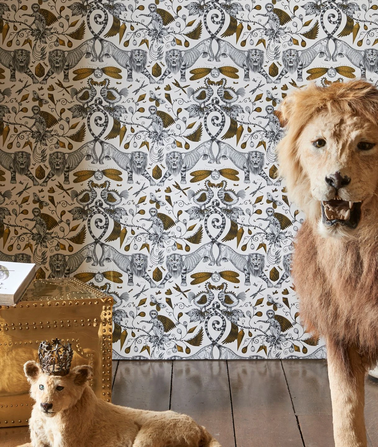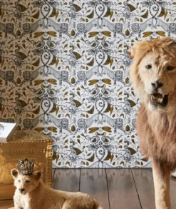 Gut gebrüllt Löwe – Tiere aus der Savanne und dem tropischen Regenwald, moderne Ornamentranken und jede Menge Abenteuerfantasie verschmelzen zu einem bizarren Musterdesign. Schimmerndes Perlgold und Grautöne setzen der opulenten Designtapete eine glamouröse Krone auf. Mit Vliestapete Bobik erhalten Ethno- und Afrika-Styles eine völlig neue Perspektive. (Bobik)