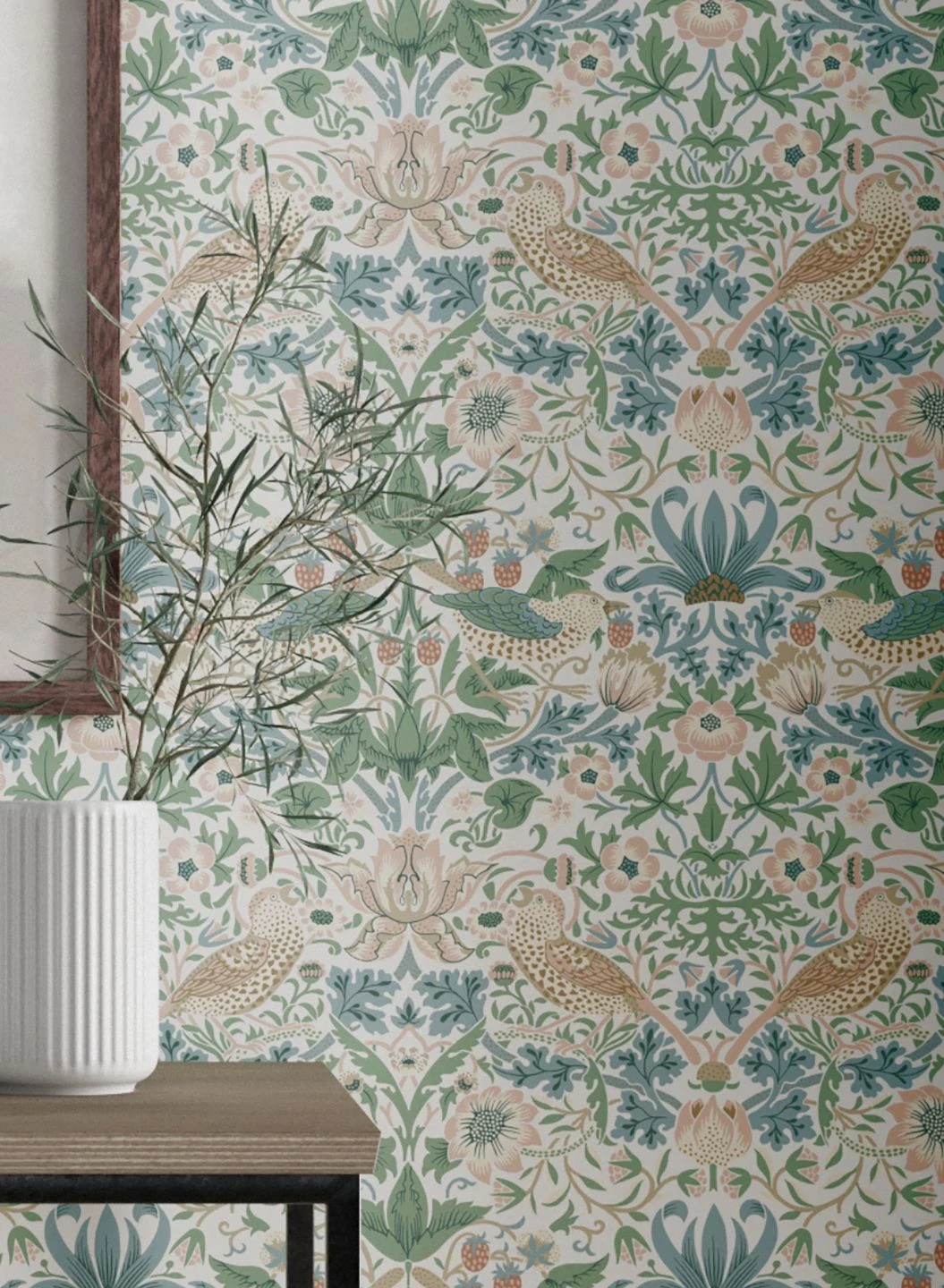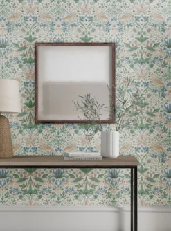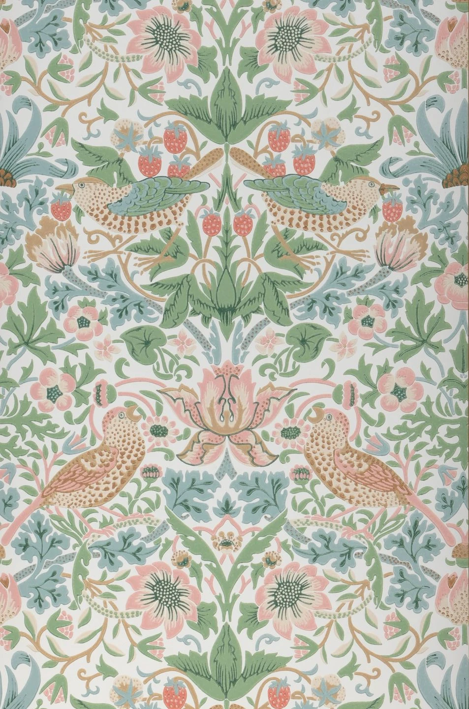 Zeitlos beliebt ist das berühmte Design des englischen Künstlers und Designers William Morris. In zarten Farben auf weißem Grund zeigt es Vögel inmitten von verspielten stilisierten Blüten, reifen Erdbeeren und den typischen Blattranken des Jugendstils. Das klassische Muster vereint Vintage-Charme mit freundlicher Leichtigkeit zu einem stilvollen Kunstwerk an Ihren vier Wänden, vor dem antike englische Möbel so richtig glänzen.