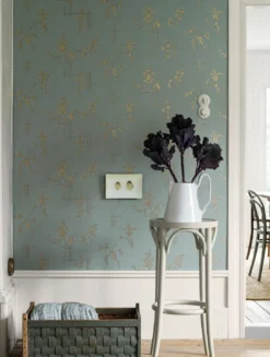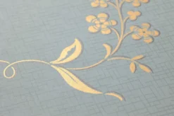 Schon in den fünfziger Jahren liebte man den Mix aus floralen und geometrischen Elementen, der eine völlig neue Wahrnehmung auslöste. Ein Musterbeispiel, angelehnt an die Vintage Tapeten von damals, ist Fiselto mit der Extraportion Glam. Auf Hellminttürkis hebt sich das goldene und braun schimmernde Muster sanft ab.