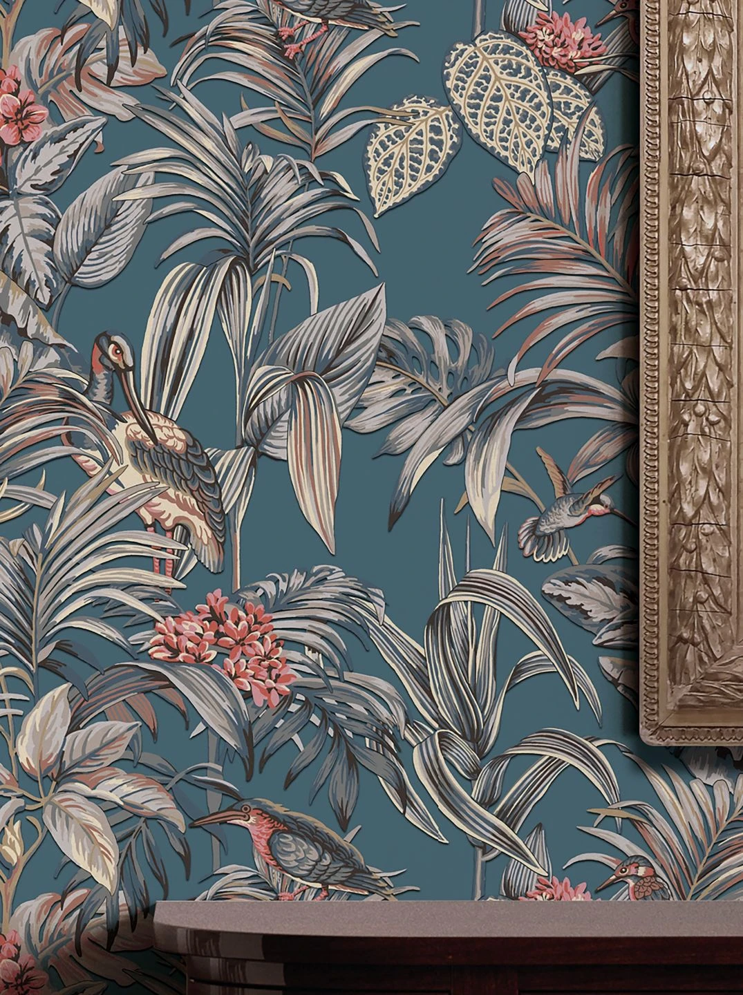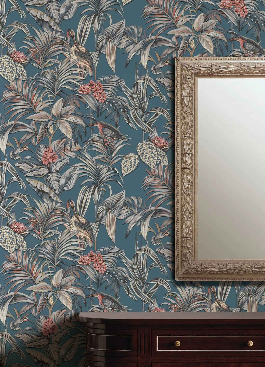 An eine handgearbeitete Stickerei auf gewebtem Untergrund erinnert die elegante Vliestapete Flonie mit ihrer feinen, in das Vinyl der Oberfläche geprägten Struktur. Die abgebildeten exotischen Vögel, Blätter und Blüten in den sanften Grau-, Blau- und Orangebrauntönen heben sich so noch mehr vom grünblauen Grund ab. Zudem ist die Oberfläche hoch waschbeständig und dadurch auch für Ihr Bad bestens geeignet.