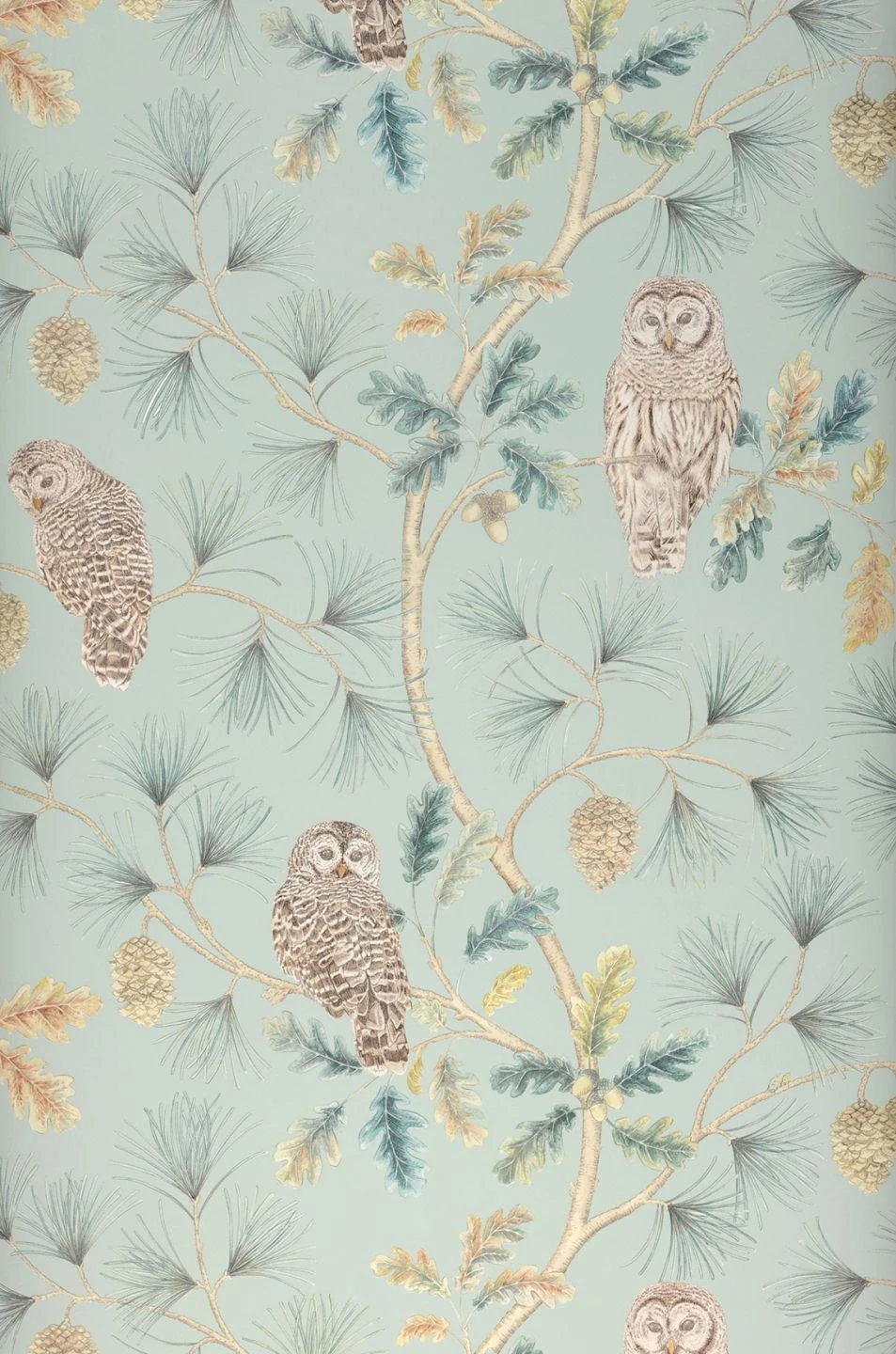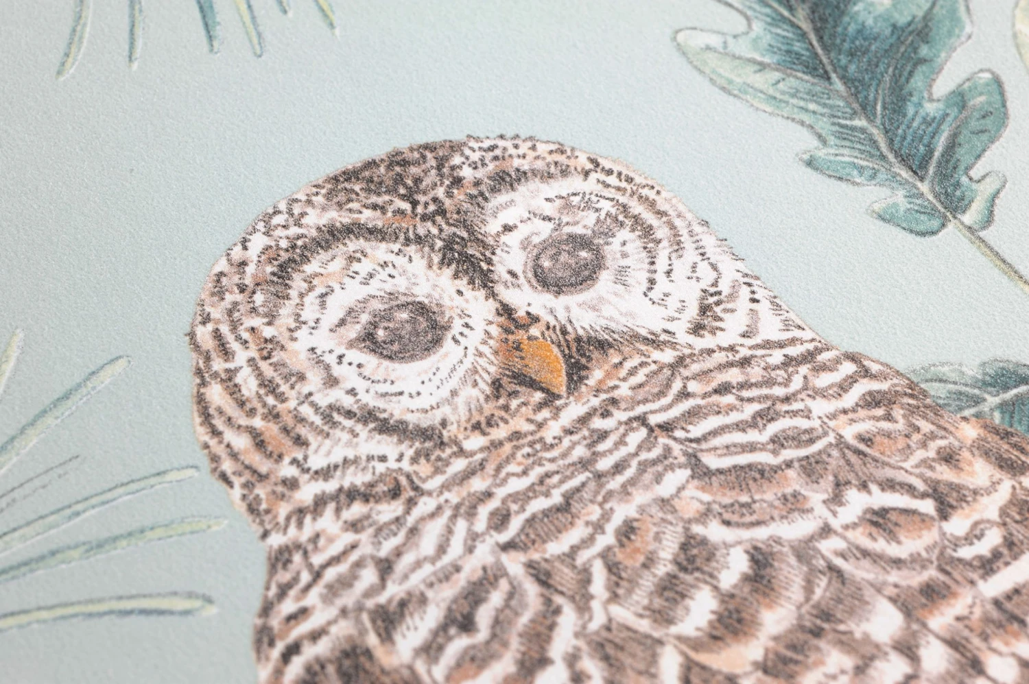 Wunderschön gezeichnet sind die Eulen, die die Vliestapete „Florentine“ bevölkern. Das Muster ihres weichen Gefieders und die ausdrucksvollen Augen kommen besonders schön zur Geltung. Auf dem blassmintgrünen Untergrund ist der natürliche Lebensraum der nachtaktiven Vögel angedeutet: Zweige mit Eichenlaub und Kiefernnadeln, dazwischen Eicheln und Kiefernzapfen, versetzen Sie in die Welt des Waldes.