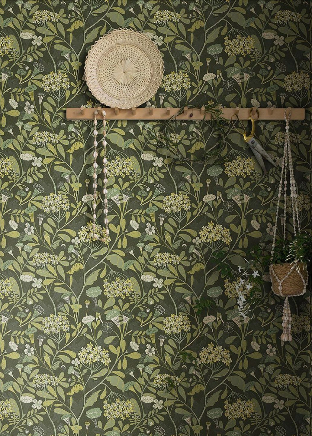 Die verschiedensten Grüntöne, ergänzt durch Gelb und Elfenbein, bestimmen den Eindruck der Vliestapete und erzeugen ein ruhiges, harmonisches Gesamtbild. Zusammengesetzt ist es wie die Artenvielfalt einer Sommerwiese – ein Kaleidoskop von Blütenformen von Dolden über Kelche bis hin zu zarten Knospen rankt sich umeinander und belebt Ihre Wände mit dem Versprechen des Sommers.