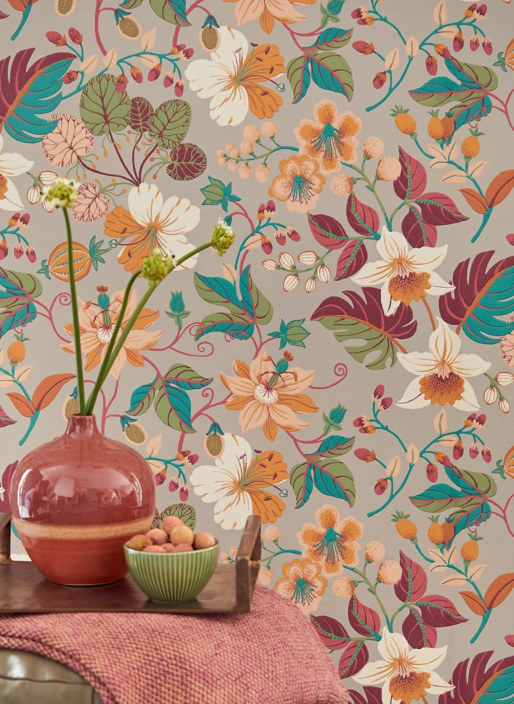 Überbordende Freude und Lust auf Diversität kennzeichnen die Ausstrahlung der ungewöhnlichen floralen Designtapete. Geschmackliche Sinnlichkeit wird durch Farben wie Cremeweiß, Erdbeerrot, Weinrot oder Wasserblau deutlich, die Steingrau in ein appetitanregendes Licht rückt.