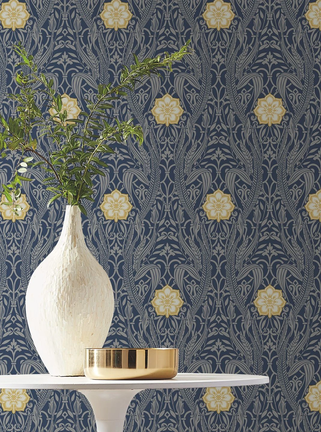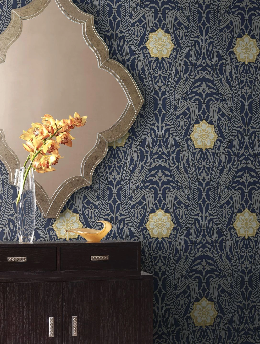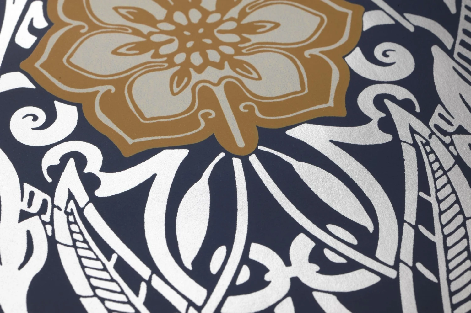 Ein kunstvolles Jugendstil-Muster aus silbern schimmernden stilisierten Blättern und Blüten auf dunkelblauem Grund umgibt regelmäßig angeordnete Blüten, die sich mit ihrem Braunbeige und Cremeweiß vom Rest des Designs abheben. Das Zusammenspiel der verschiedenen Farbfamilien und der schimmernden und matten Ornamente vereint Gegensätze und macht Papiertapete Gatsby zu einem interessanten Schmuck für einen schick gestylten Raum.