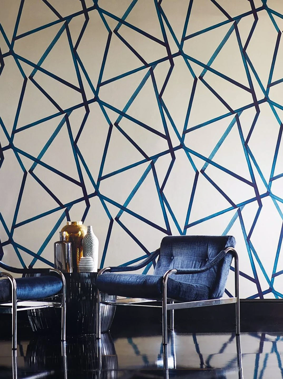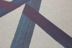 Aus einfachen geraden Pinselstrichen ergibt sich die ausgeklügelte geometrische Struktur dieser modernen Tapete. Vom sanft schimmernden steingrauen Grund heben sich die dunklen Blautöne des Musters angenehm ab. Die Farbverläufe erwecken den Eindruck dreidimensionaler Tiefe wie bei einer abstrakten Skulptur. So begrenzt Holika den Raum und scheint ihn gleichzeitig nach außen zu öffnen. Geschwungene Möbelkonturen bilden einen reizvollen Kontrast zu ihren geraden Formen.
