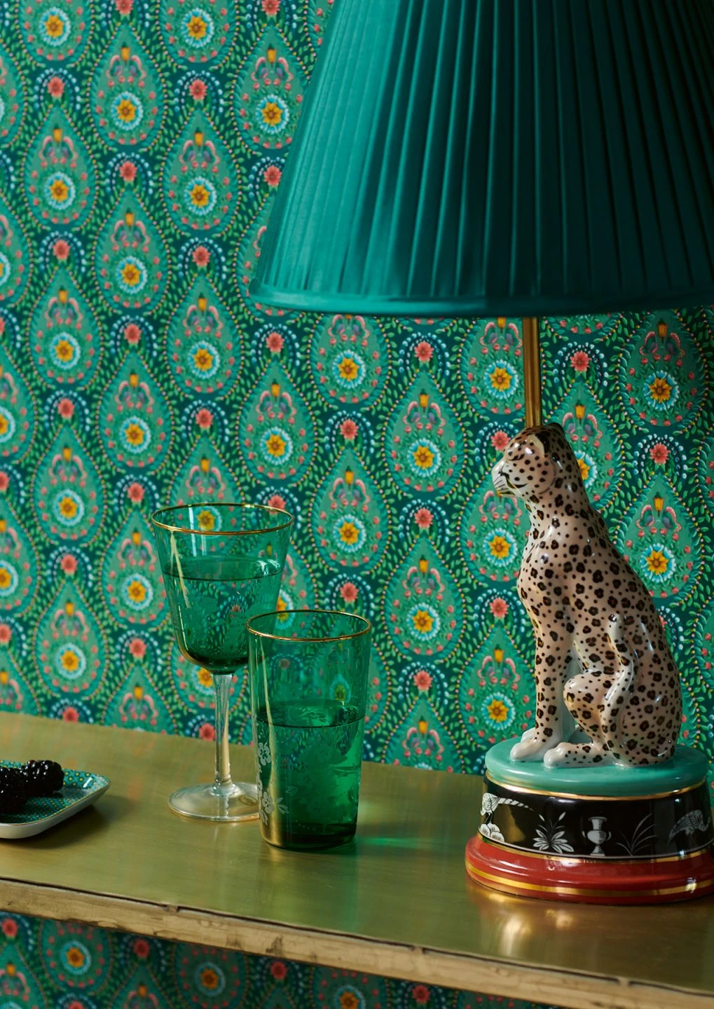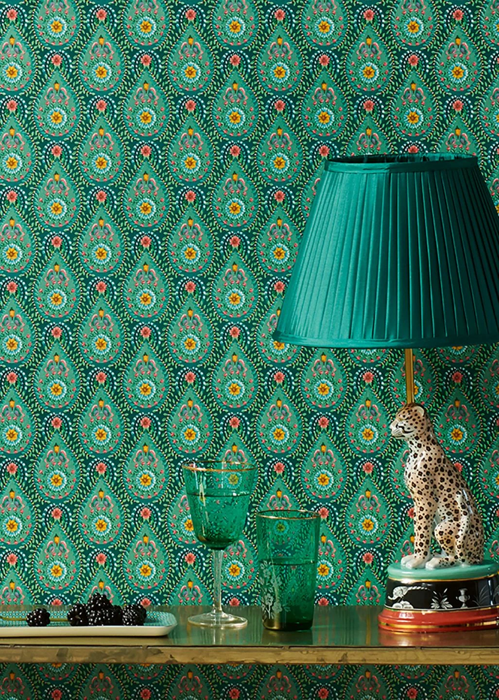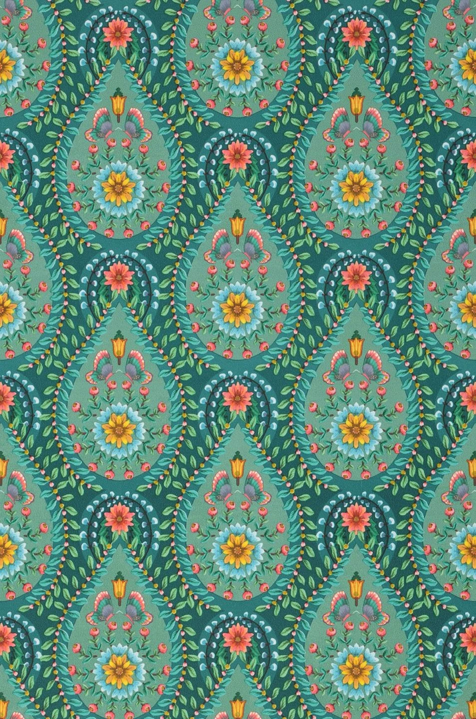 Märchenhafte Stimmung wie in einer Erzählung aus „1001 Nacht“ zaubert diese farbenfrohe Vliestapete. Aus verschiedenen kreisförmig angeordneten Blüten, Schmetterlingen und rankenden Zweigen entstehen dicht an dicht tropfenförmige Ornamente im orientalischen Stil. Die vorherrschenden Farben sind ruhige Grün- und Blaugrüntöne. Doch die Details in Hellblau, Rot und Sonnengelb sorgen für leuchtende Akzente.