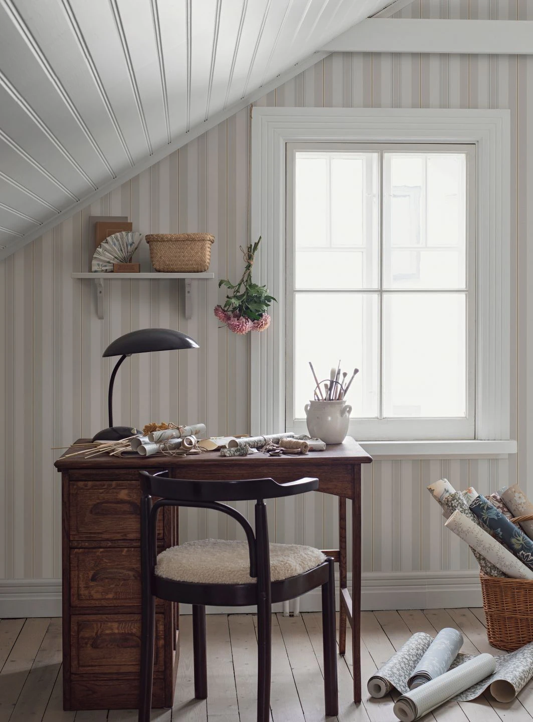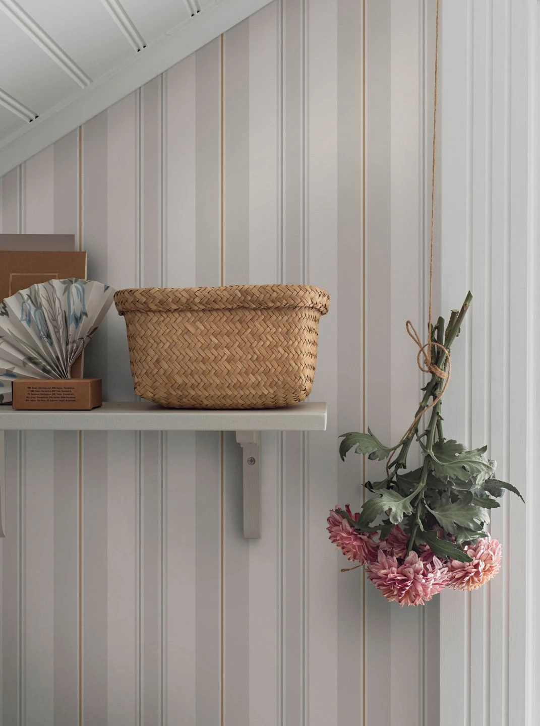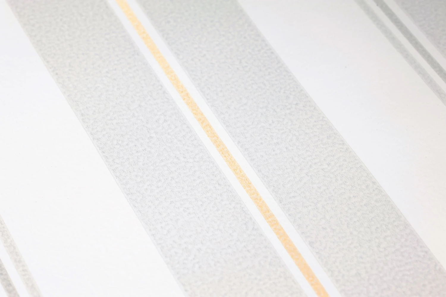 Leicht und durchlässig anmutende Streifen betonen die senkrechte Dimension Ihres Raumes. Zarte Grautöne wechseln sich mit Weiß ab, während feine Linien in Perlgold wirkungsvolle Akzente setzen. Die lockeren, unterschiedlich breiten Streifen geben Ihrem Raum eine fast unmerkliche Ordnung und machen ihn gleichzeitig wohnlich und gemütlich. Natürliche Holztöne oder Weiß unterstreichen die Wirkung besonders schön.