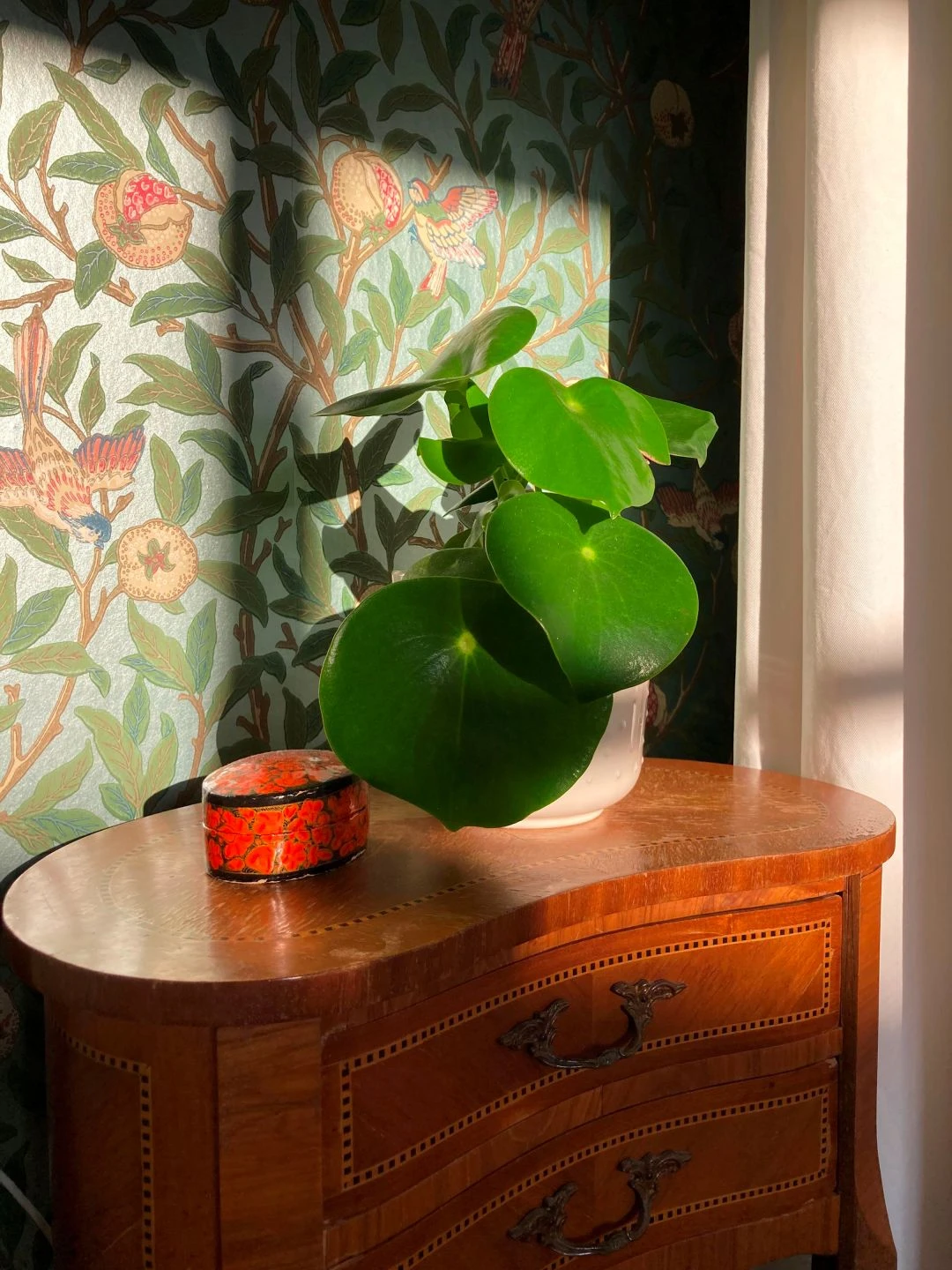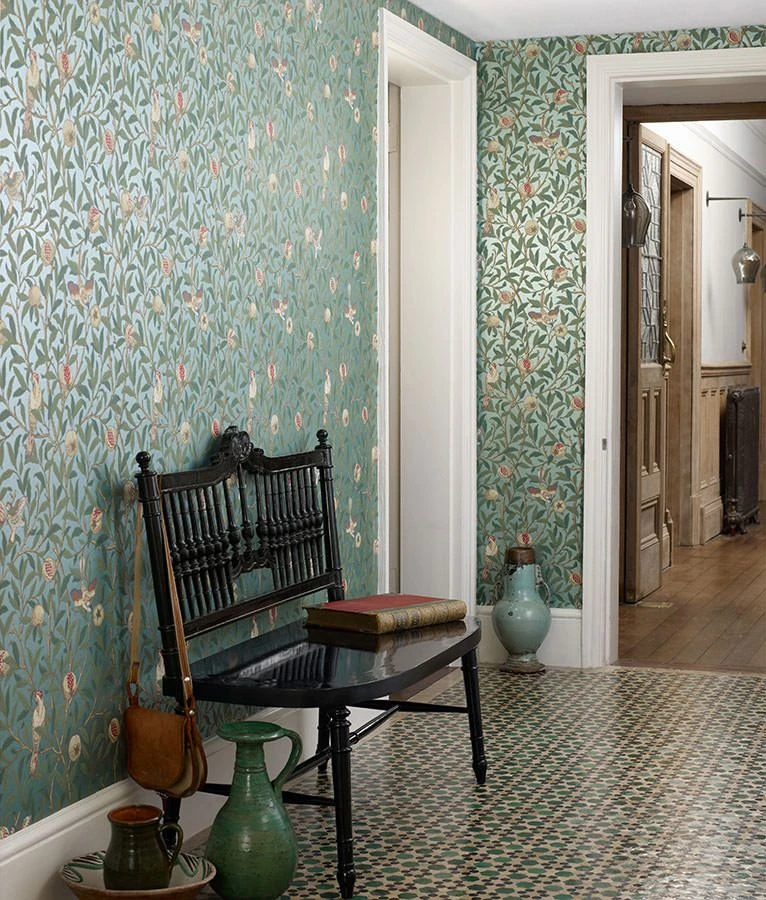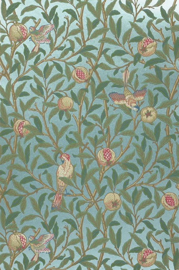 Zwischen den üppigen Granatapfelzweigen und -Früchten tummeln sich Vögel auf der Suche nach dieser Köstlichkeit. Der Untergrund schimmert in Pastelltürkis und macht dieses Stück so einzigartig.