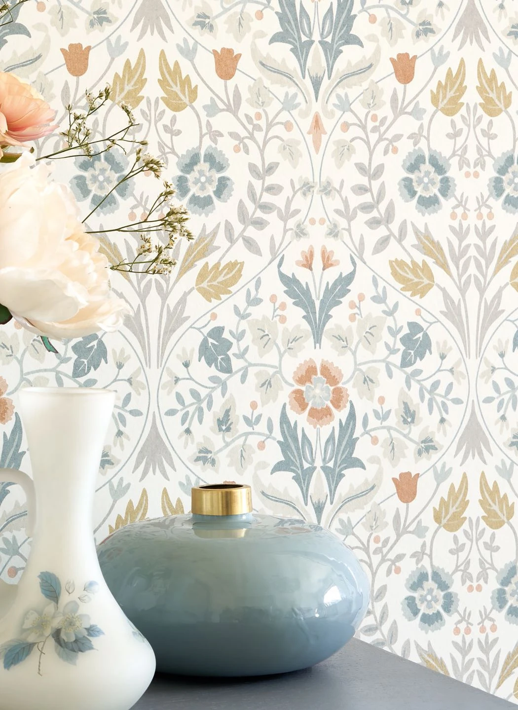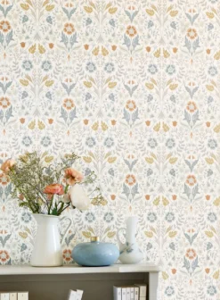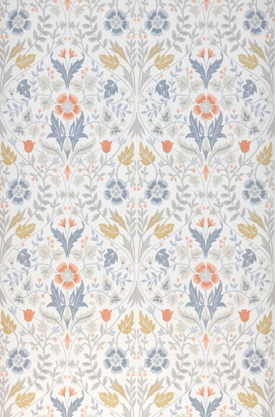 Die stilisierten und dennoch leichtfüßig wirkenden Blüten, Blätter und Ranken in hellen Farben verbinden das klassische Tapetendesign in der Tradition des britischen Künstlers William Morris mit aktueller Frische und Leichtigkeit. Auf dem cremeweißen Grund sind die floralen Ornamente in zarten Blau-, Grau- und Rotorangetönen symmetrisch angeordnet und bilden einen ebenso unaufdringlichen wie dekorativen Hintergrund für eine lichtdurchflutete Küche oder ein stilvolles Wohnzimmer.