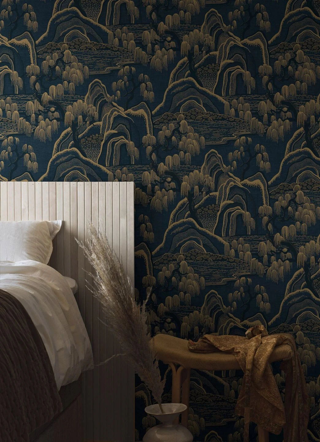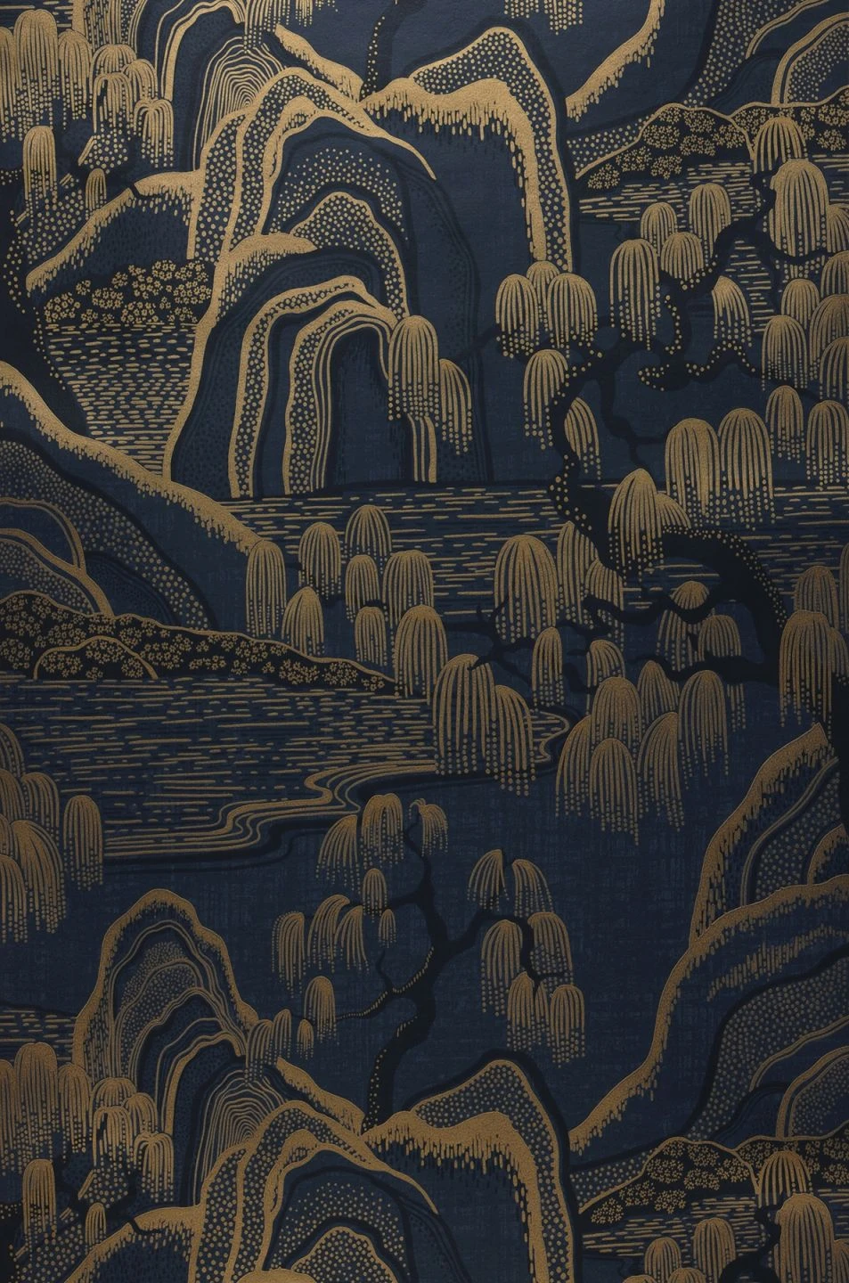 Nur aus Linien, Punkten und Tupfern von Goldfarbe und Schwarz entsteht auf dem ins Blaue spielenden Anthrazitgrau des Hintergrunds eine japanische Parklandschaft. Berge, Bäume mit hängenden Zweigen, Blumen und stille Teiche werden nur angedeutet. Die Tapete lebt vom Kontrast des schimmernden Goldes zum dunklen Grund und nimmt Sie mit auf eine Reise durch Raum und Zeit ins Reich der japanischen Ästhetik.