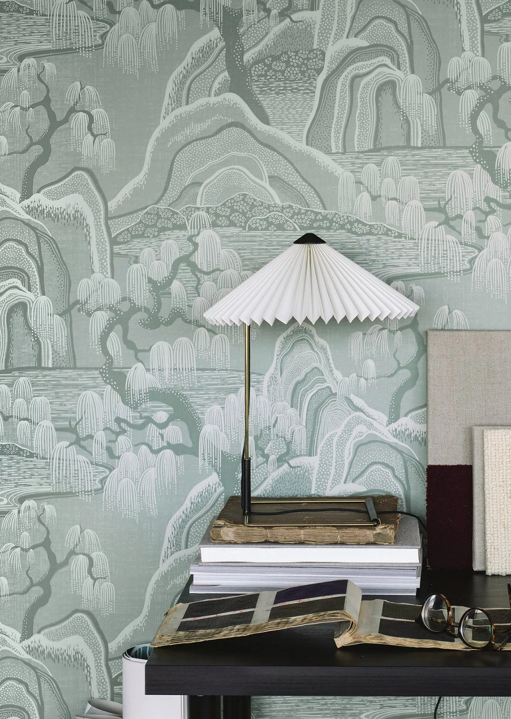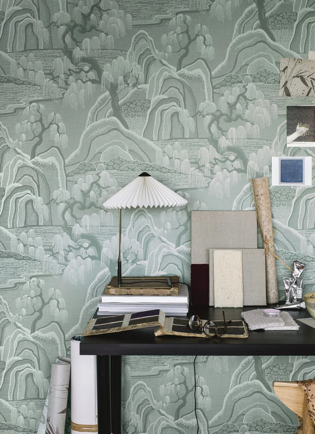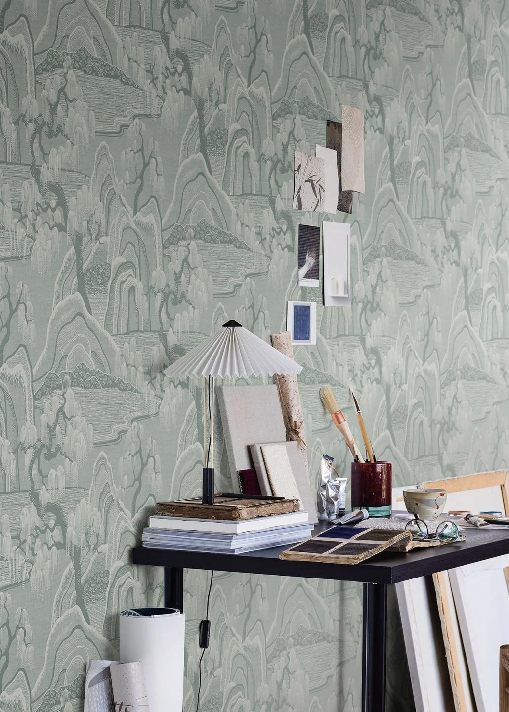Das helle Minttürkis des Untergrunds bestimmt die Farbwirkung dieser Vliestapete. Nur angedeutet mittels grauweißer und minttürkisfarbener Linien, Punkte und Farbtupfer, aber deutlich zu erkennen ist die Landschaft eines japanischen Parks – voller Bäume und Blumen, Teiche und Berge. Entweder Ton in Ton oder mit dunklen, sachlichen Möbeln – die Tapete bietet vielfältige Kombinationsmöglichkeiten und eine Kulisse, in der man den Blick schweifen lassen kann.