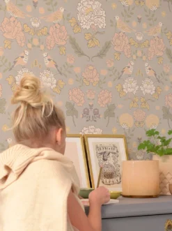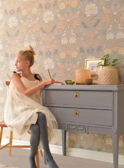 Große Blüten, Blätter und Vögel in Weiß, blassen Grün- und Orangetönen und Sandgelb folgen auf dem hellgrauen Grund der Vliestapete einer zugrundeliegenden Symmetrie. Das Design aus dem Hause Majvillan erinnert an klassische Tapetenentwürfe des britischen Künstlers und Designers William Morris, die es kunstvoll in die heutige Zeit überträgt. Konsequent passt dazu die Herstellung der Tapete im traditionellen Leimdruckverfahren.