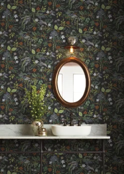 Eine bunte Vielfalt von verschiedenen Blüten, Blättern und Früchten bildet einen lebhaften Gegensatz zum dunklen Untergrund der Papiertapete, der die kräftigen Farben besonders zum Leuchten bringt. Wie mit Pinseln auf das Papier getupft sehen die Blätter und Blüten aus. Durch diese Technik wirkt die Tapete gleichermaßen edel wie leicht.