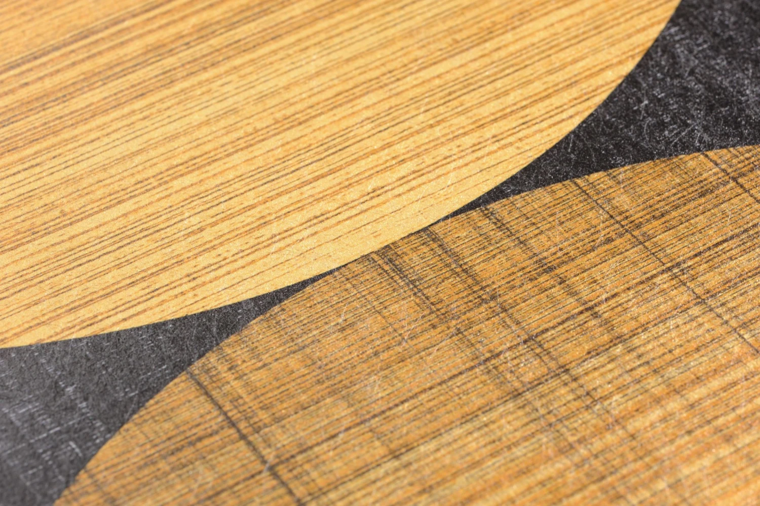Große Kreise in verschiedenen Nuancen von Goldgelb überschneiden sich und bilden ein regelmäßiges geometrisches Muster. In der Kombination mit Schwarzgrau fällt der goldgelbe Schimmer besonders ins Auge. Die Farbflächen weisen eine Struktur auf, die an textiles Gewebe erinnert. „Kasavu“ überträgt die Formensprache der 70er Jahre ins Hier und Jetzt und schafft eine exklusive Atmosphäre für Ihren Raum.