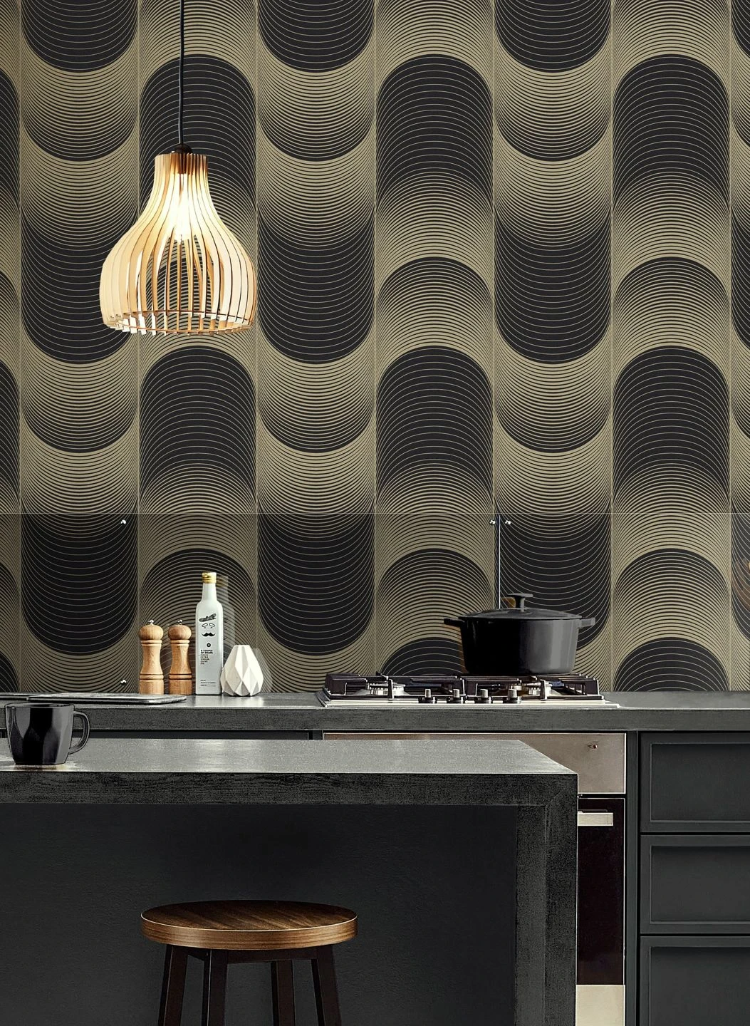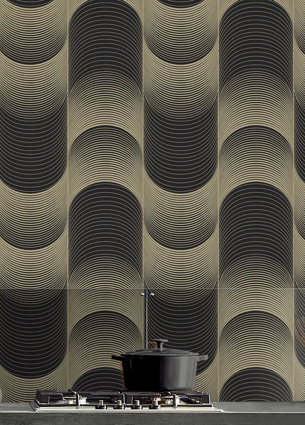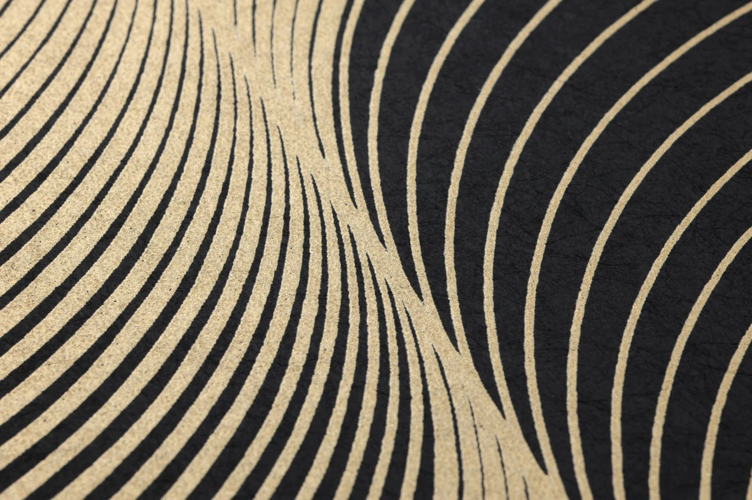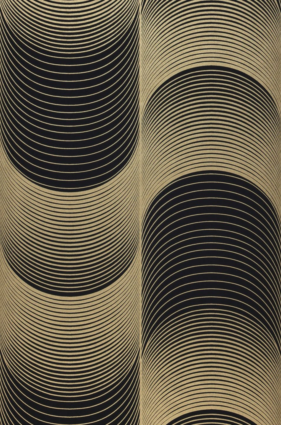 Raffiniert angeordnete Wellenlinien erzeugen ein wirkungsvolles Muster: Auf Ihrer Wand entsteht ein dreidimensionaler Effekt, der an einen kostbaren, in großzügigen Wellen fallenden Vorhang erinnert. Mattgold und Schwarz sorgen für einen eleganten Retro-Schick. Das ausgefallene geometrische Design der Vliestapete Katsura spielt mit den Abmessungen Ihres Raumes und der ebenen Fläche Ihrer Wand und strahlt kühle Eleganz aus.