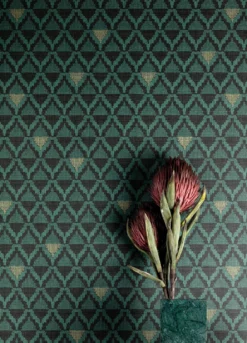 Das helle Patinagrün und der Elfenbeinton leuchten förmlich zwischen den schwarzgrauen Musterelementen hervor. Die verschiedenen feinen Schraffuren erzeugen trotz der glatten Oberfläche der Vliestapete die Anmutung einer Textiltapete. Geheimnisvoll wie in einem orientalischen Märchen wirkt das entstehende Muster aus Rauten und Farbstreifen, das Ihre Wände mit einem Hauch von Exotik belebt.