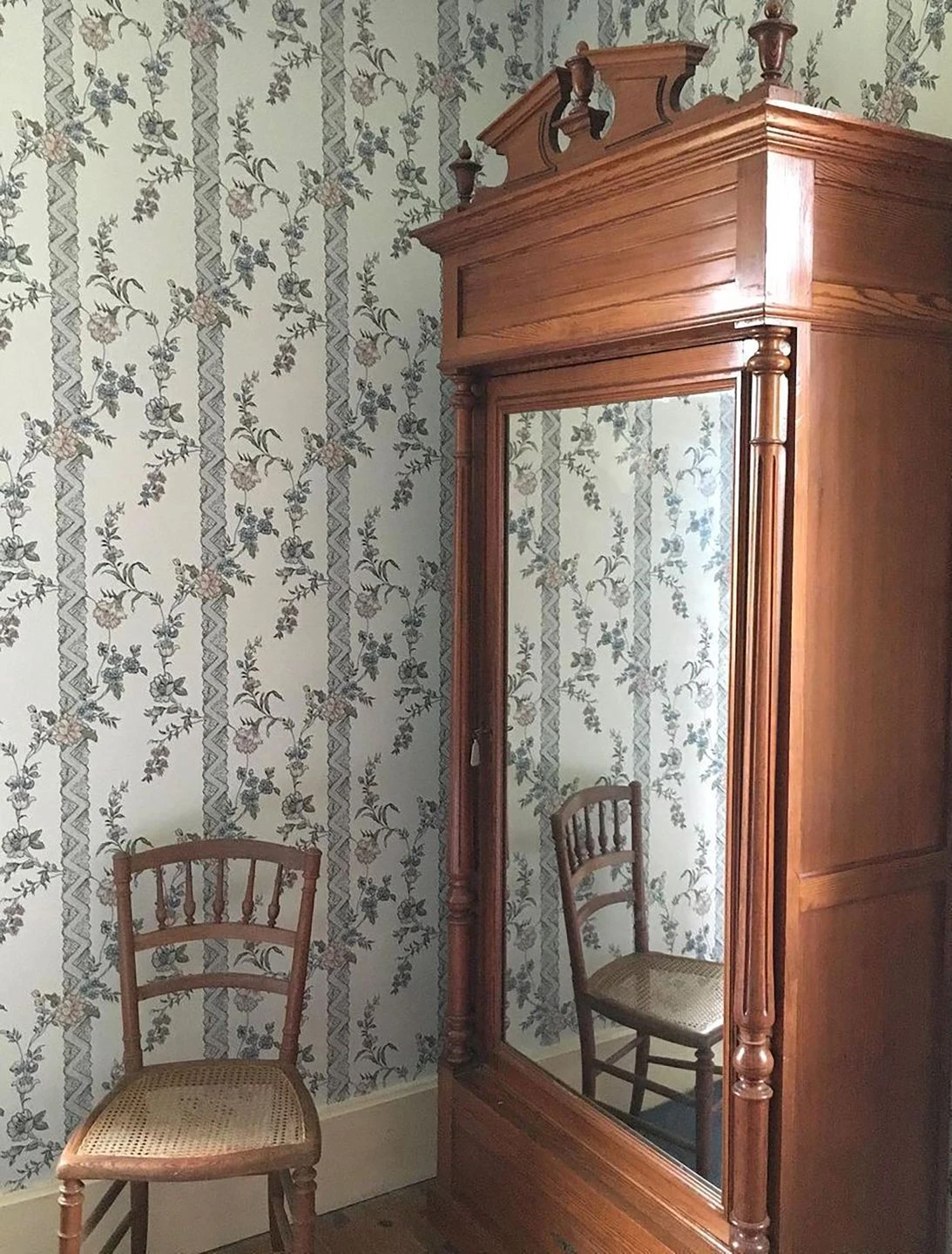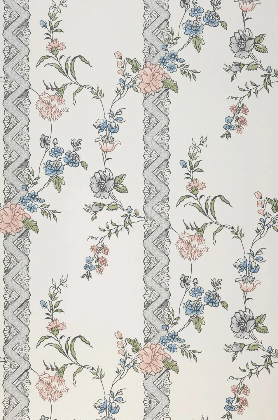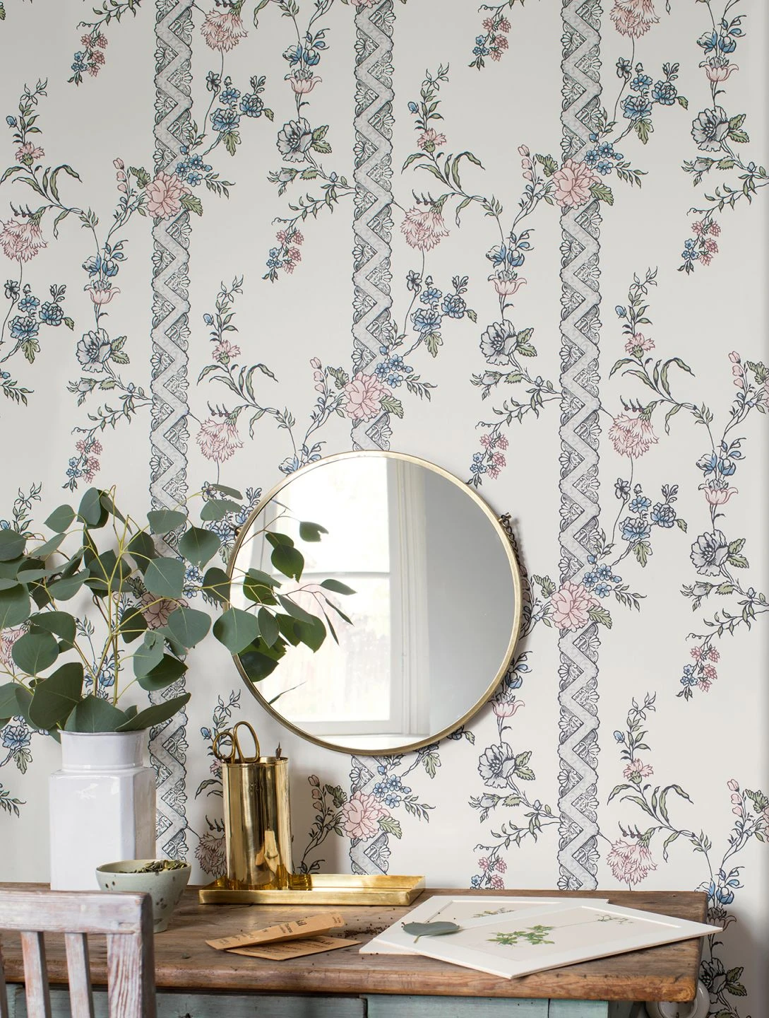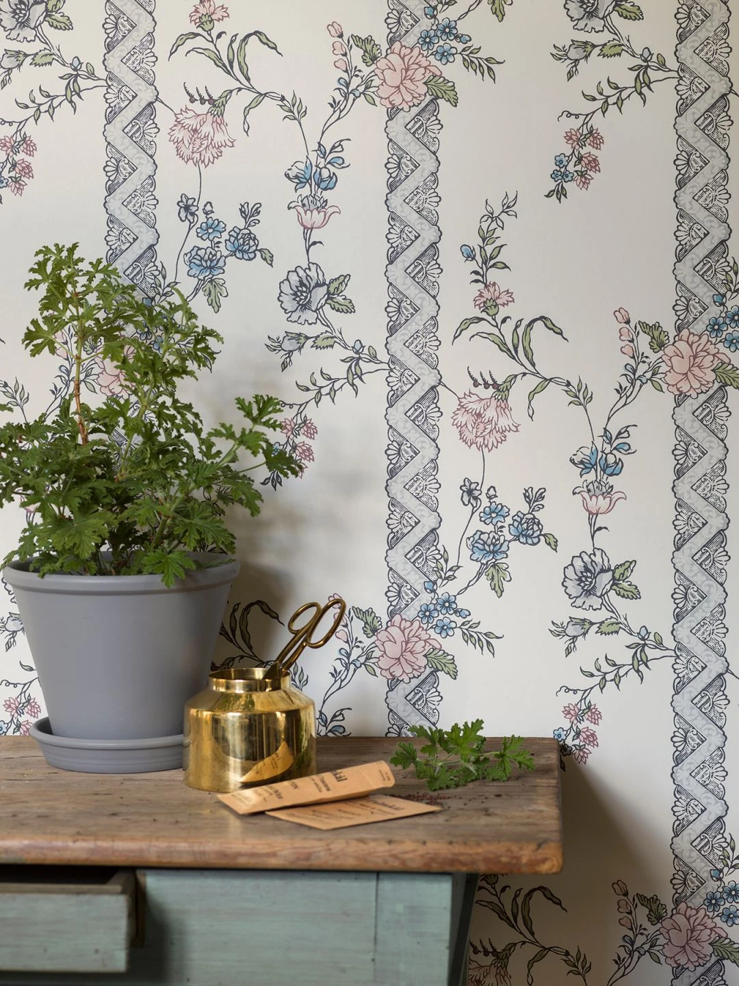 Ein Hoch auf dieses klassisch angehauchte Tapetenmuster, das aus starren Regeln ausbricht. Die munteren Blumenkranken schlängeln sich ohne Rücksicht auf Symmetrie über die kunstvoll gestalteten Streifen hinweg. So, wie sich die Fantasie aus engen Grenzen befreit und den Gedanken ihren Lauf lässt.