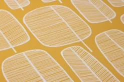 Sonnig leuchtendes Goldgelb bildet den Hintergrund eines stilisierten lichtdurchfluteten Waldes, der durch einfache Schraffur angedeutet wird. Die verschiedenartigen Formen der Bäume stehen für die Vielfalt der Natur und schaffen doch durch die schlichte Zeichentechnik ein geschlossenes Gesamtbild. Die hellen, fröhlichen Farben sorgen für sommerliche Atmosphäre.